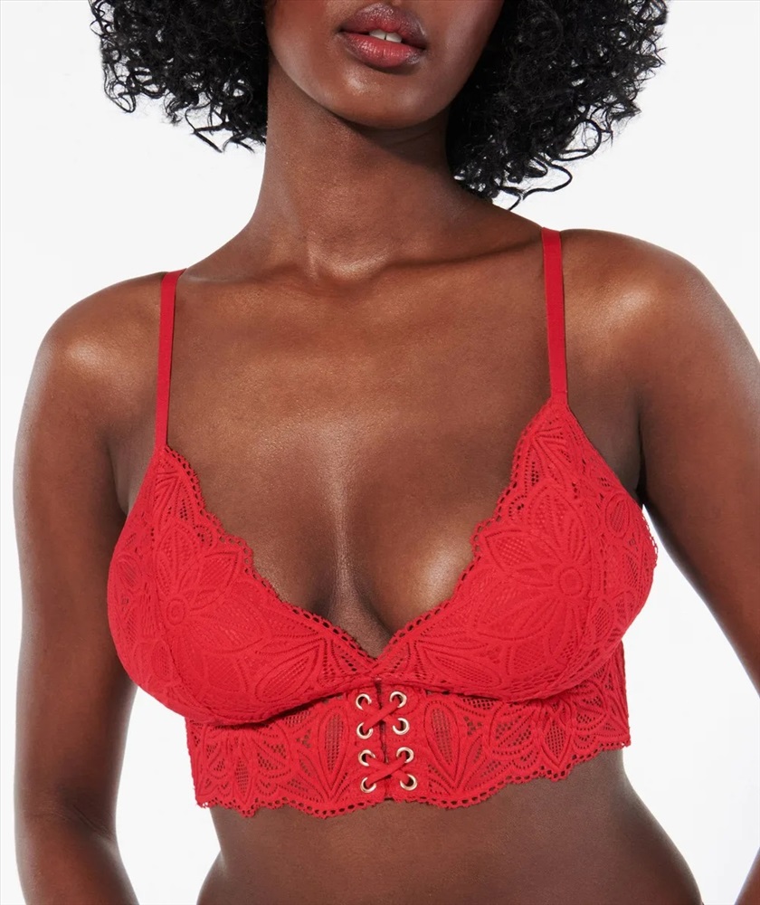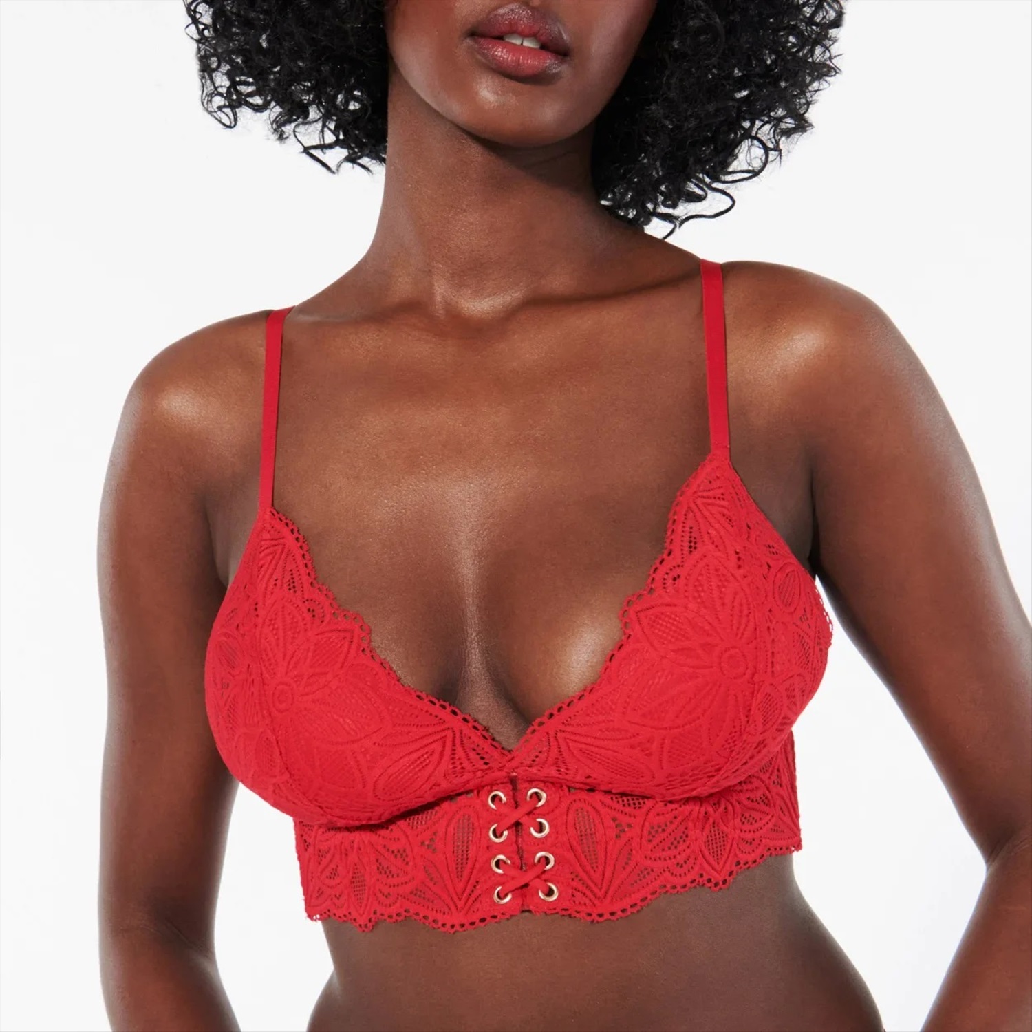 Descubre el sujetador rojo CUTIEPIZ. Es perfecto para resaltar tu feminidad. Es un triángulo push-up de encaje floral y acolchado con una lazada en la parte delantera. Además, forma parte de nuestra gama We Care. Puedes ser sexi sin dejar de ser responsable.