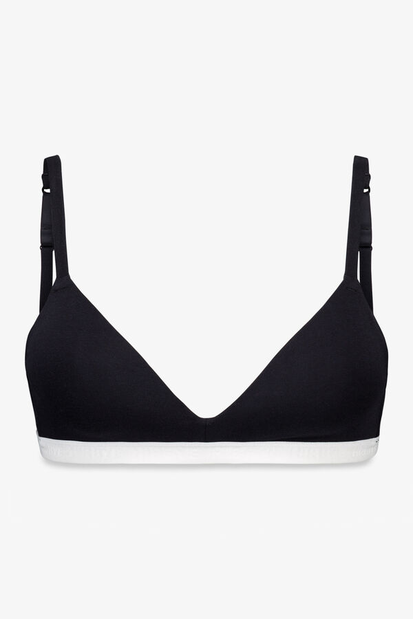 Sujetador triangular con foam fijo. Confeccionado en algodón con estructura de canalé. Goma elástica bajo pecho con logo de la marca efecto Jacquard.