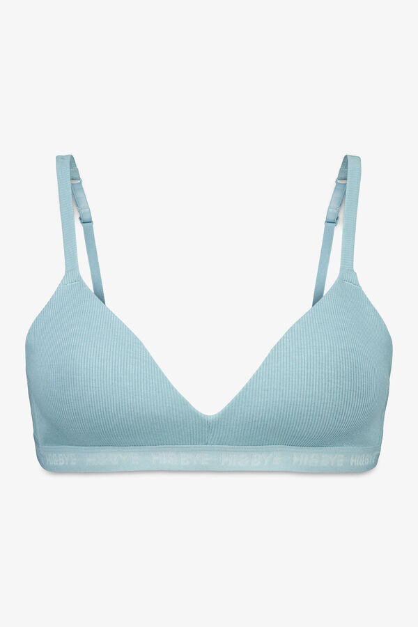 Sujetador triangular con foam fijo. Confeccionado en algodón con estructura de canalé. Goma elástica bajo pecho con logo de la marca efecto Jacquard.