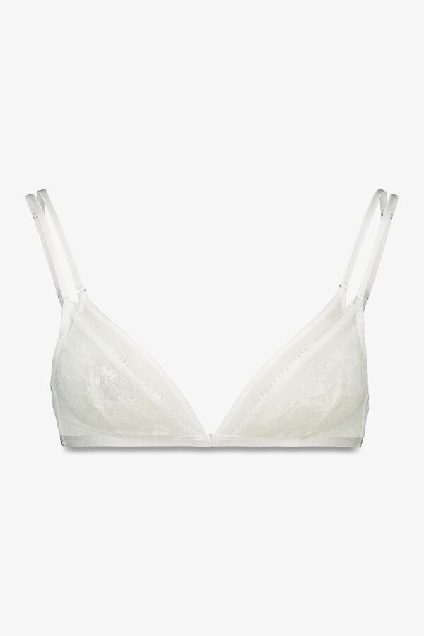 Sujetador triangular NATURAL sin relleno ni aro. Confeccionado en tejido de encaje y tul con detalles de lurex, brindando comodidad y sujeción natural. Ideal para quienes buscan ligereza y estilo.