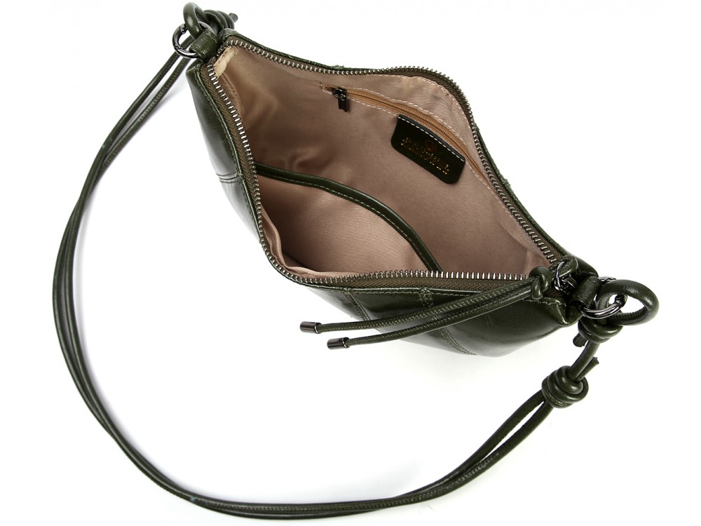 Сумка из натуральной кожи с длинным ремешком на плечо. Одно основное отделение застегивается на молнию. Внутри: два кармана для аксессуаров.