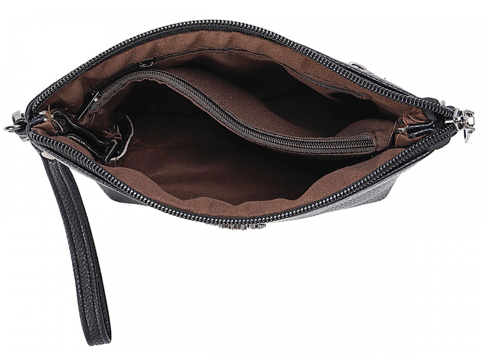 Два основных отделения. Внутри центральный карман на молнии и дополнительный внутренний карман на молнии для мелочей. Сумка хорошо держит форму.