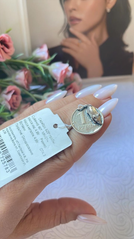 Сувенир из серебра с чернением - Мышь кошельковая на рубле МК-01ч