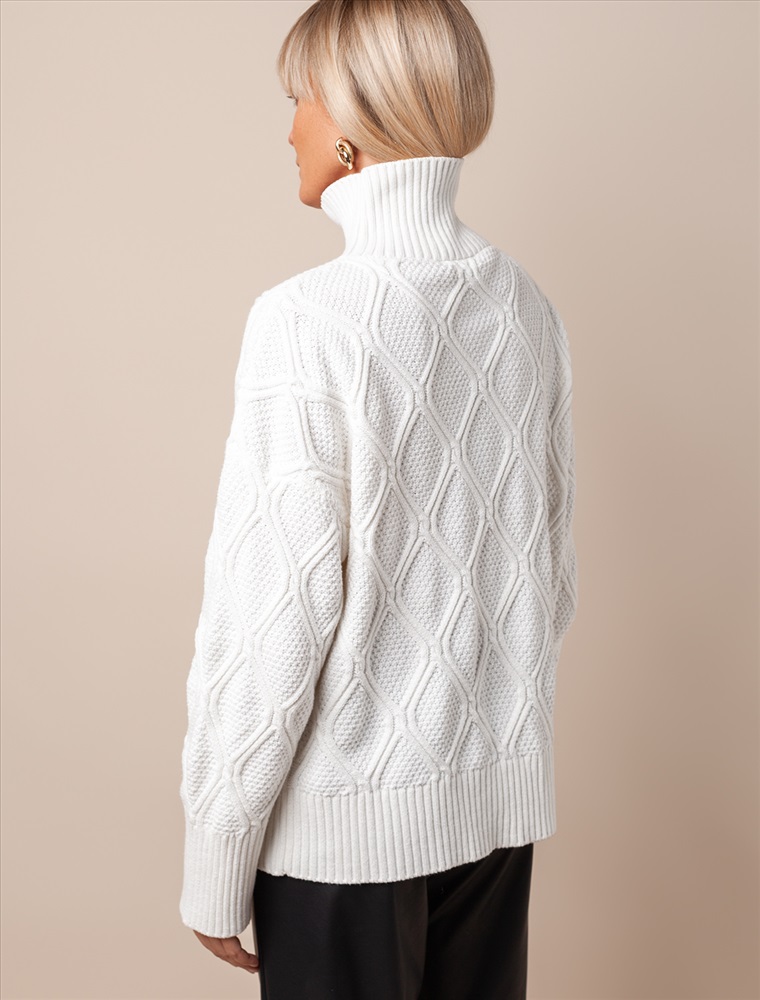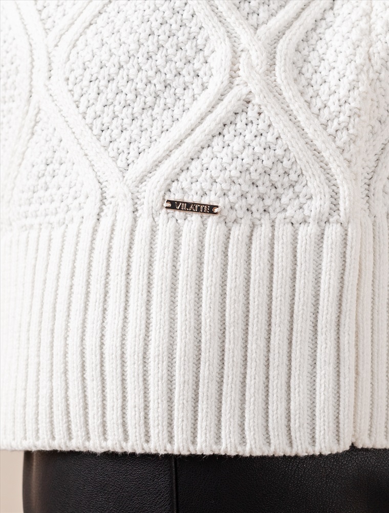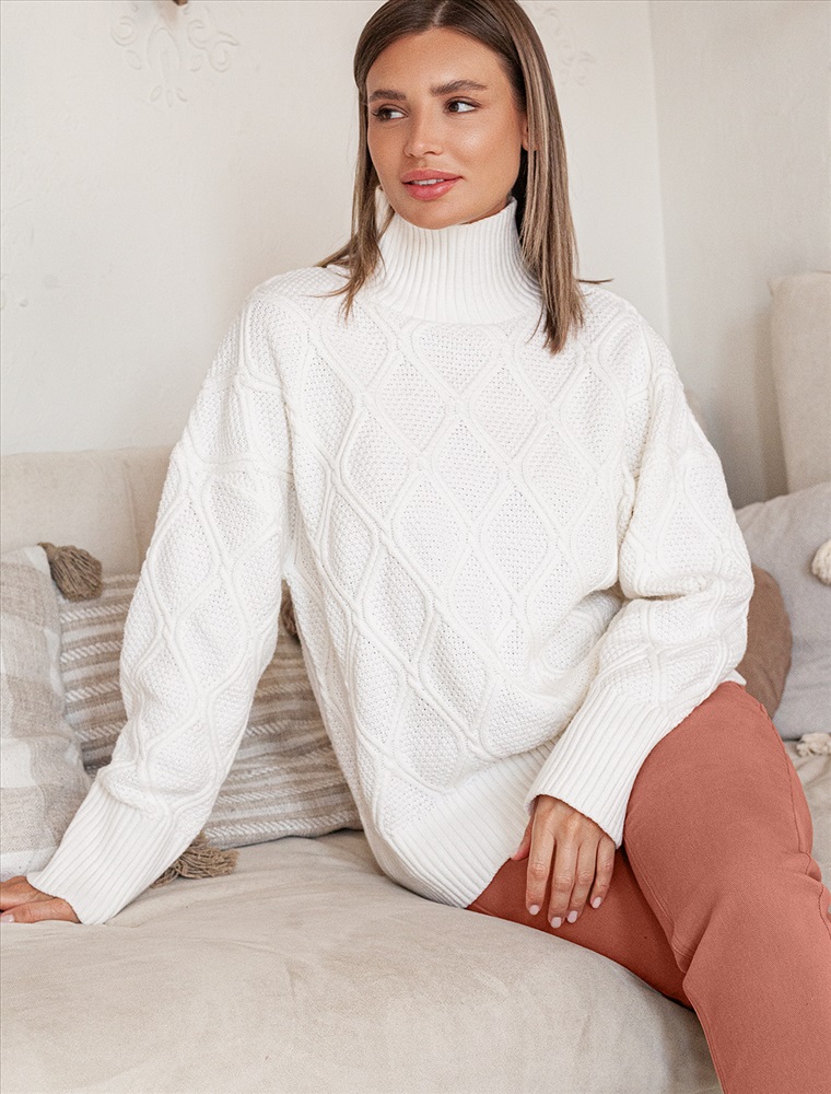 Параметры модели на первом фото: Рост 170, бюст 89, талия 63, бедра 92 Свитер выполнен из хлопковой пряжи крупной резной вязки. Мягкая фактура свитера очень комфортная к телу, абсолютно не колется и позволяет носить изделие даже на голое тело. Добавление акрила в состав изделия способствует шелковистости и дополнительному теплу. Трендовый геометрический узор отлично впишется в осенне-зимний гардероб. Комментарии к товару