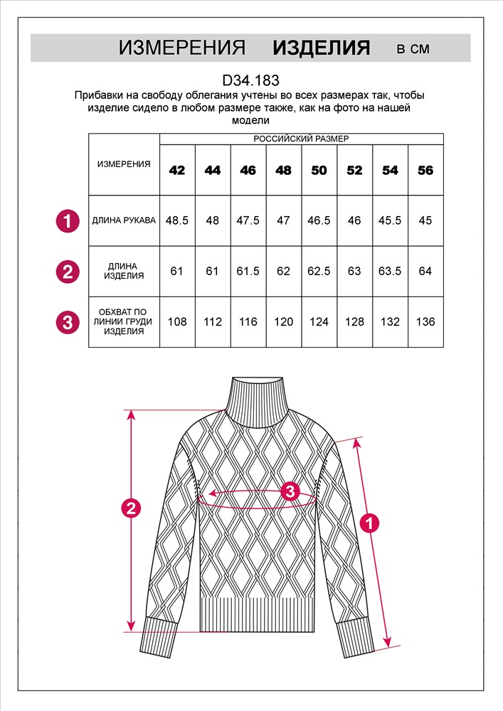 Параметры модели на первом фото: Рост 170, бюст 89, талия 63, бедра 92 Свитер выполнен из хлопковой пряжи крупной резной вязки. Мягкая фактура свитера очень комфортная к телу, абсолютно не колется и позволяет носить изделие даже на голое тело. Добавление акрила в состав изделия способствует шелковистости и дополнительному теплу. Трендовый геометрический узор отлично впишется в осенне-зимний гардероб.