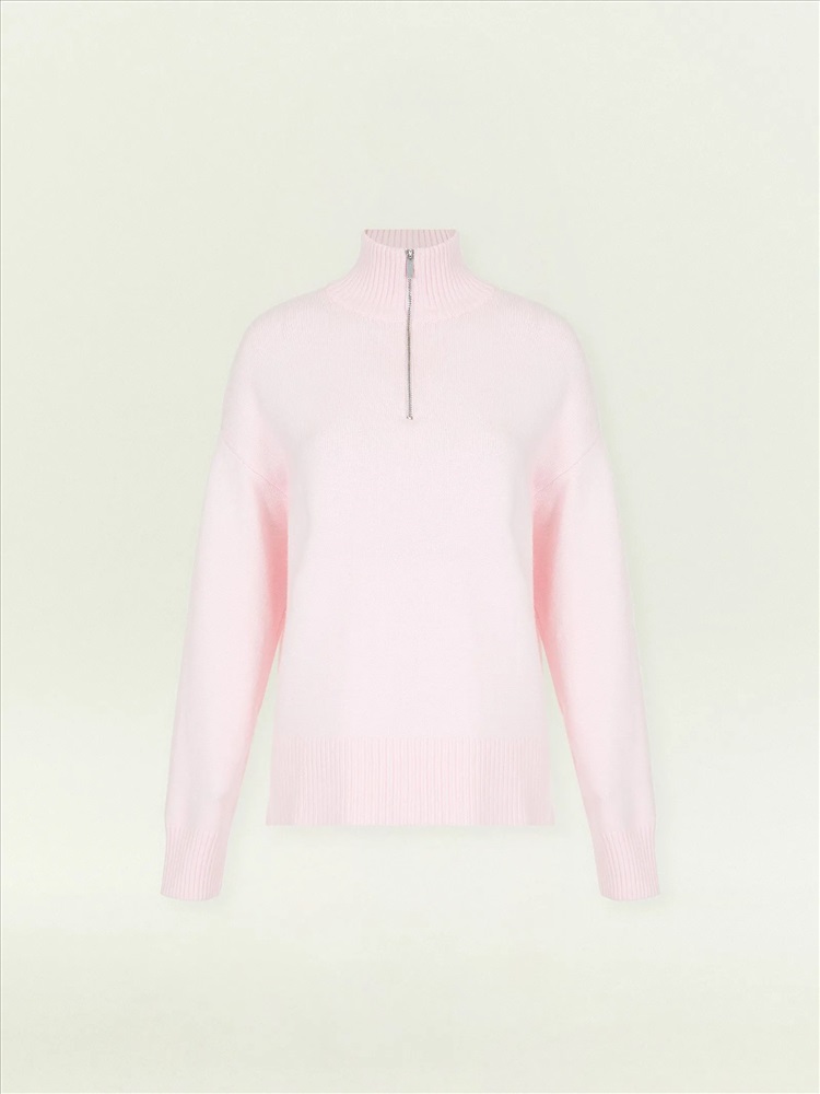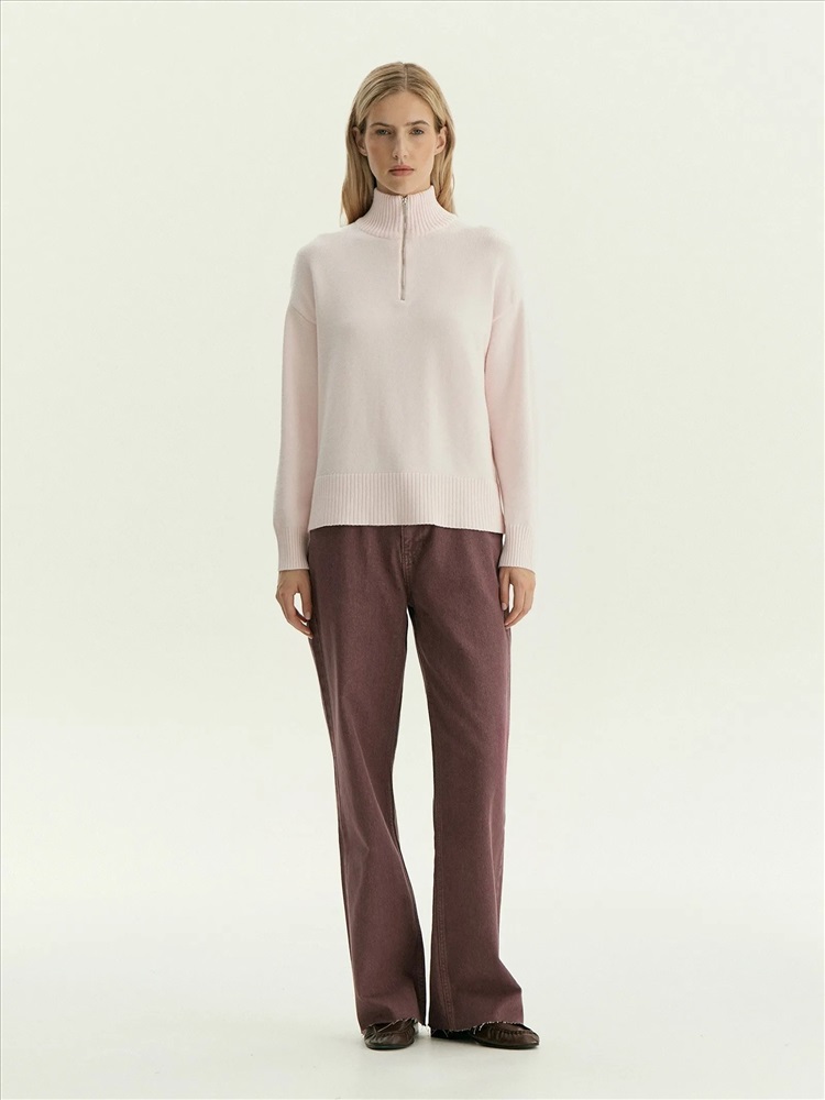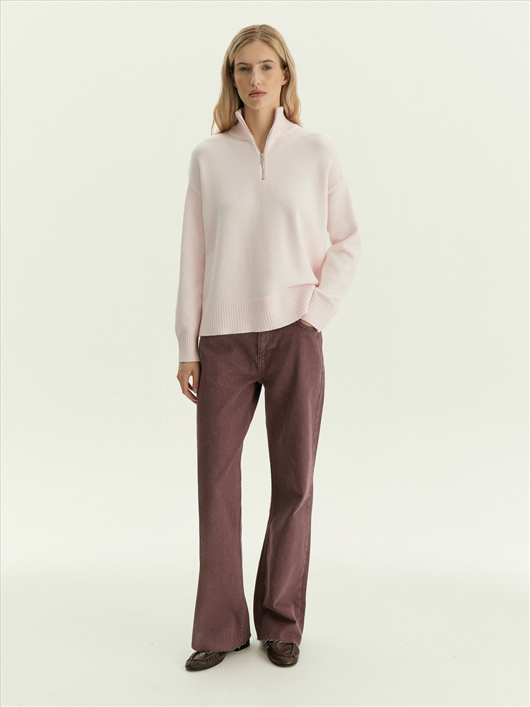 Мягкий свитер с воротником на молнии отлично подойдёт для любых повседневных дел. Регулируемая высота воротника или глубина выреза даёт ещё больше комфорта. Свитер хорошо держит форму после стирок, не линяет и хорошо ощущается на теле благодаря своему составу. Долговечен и прост в уходе. Выполнен с высоким содержанием вискозы и добавлением нейлона. Розовый цвет хорошо сочетается с коричневым, хаки, золотистым, кофейным и бежевым. Лучшей парой к свитеру станет трендовый деним.