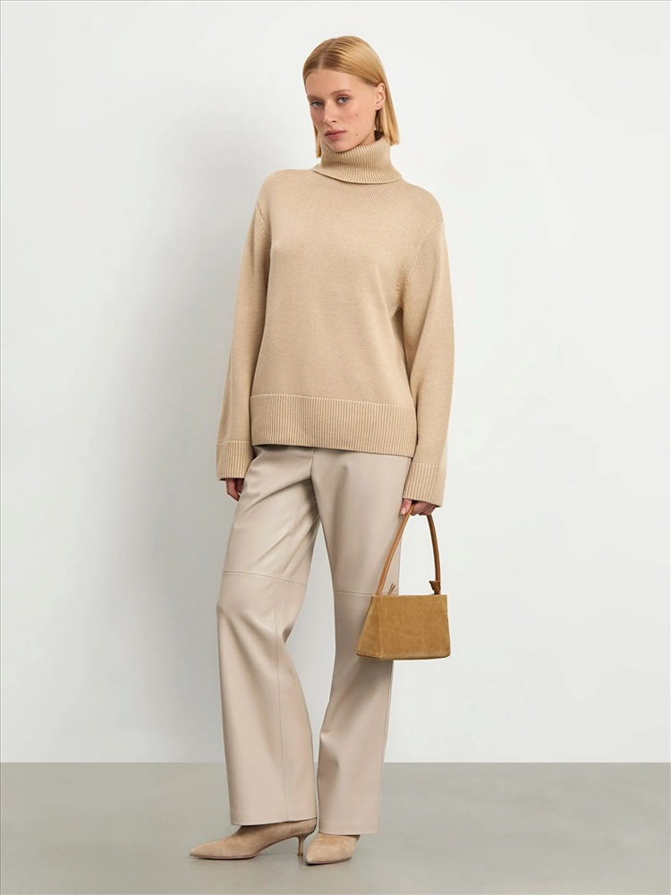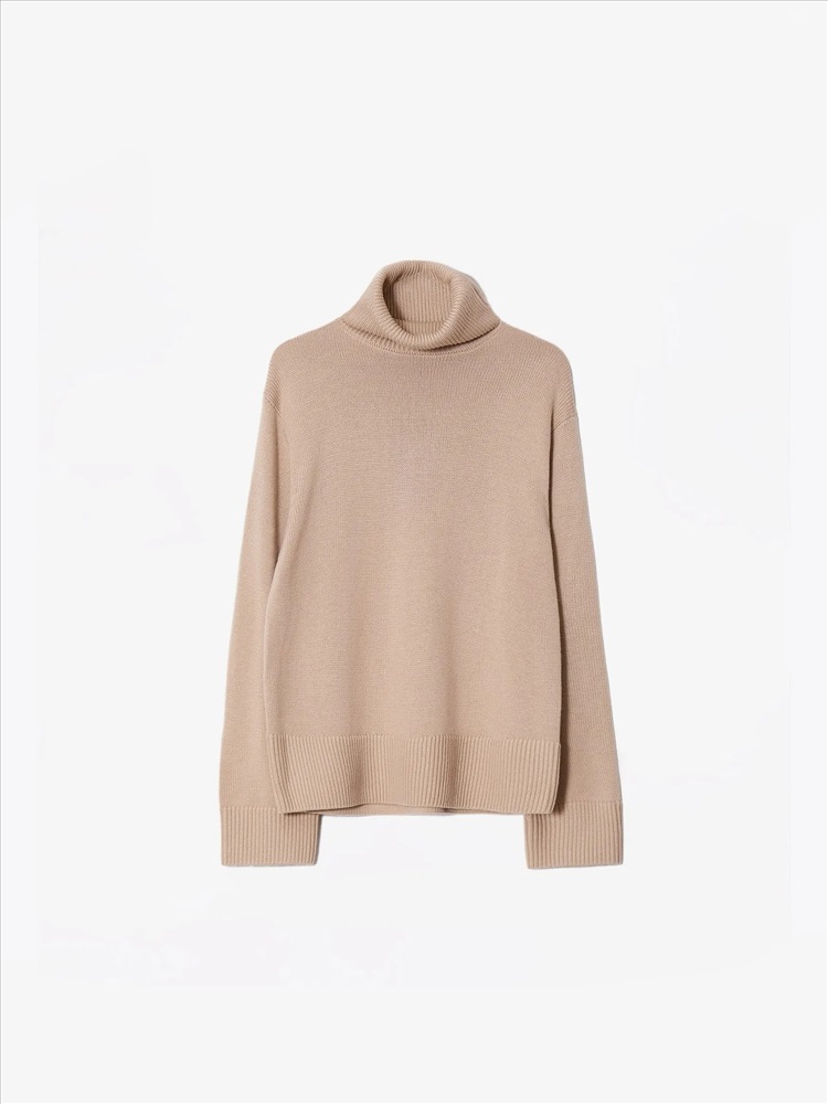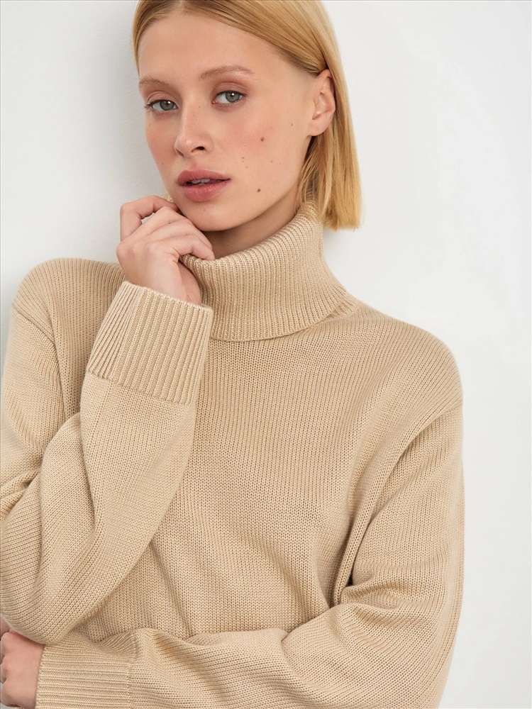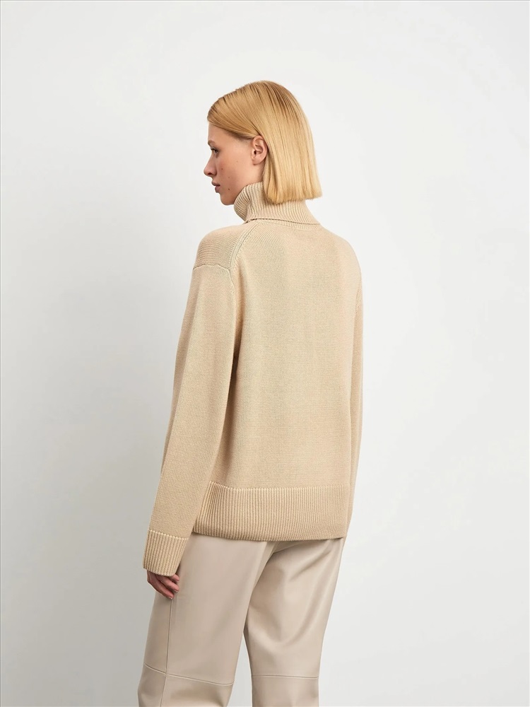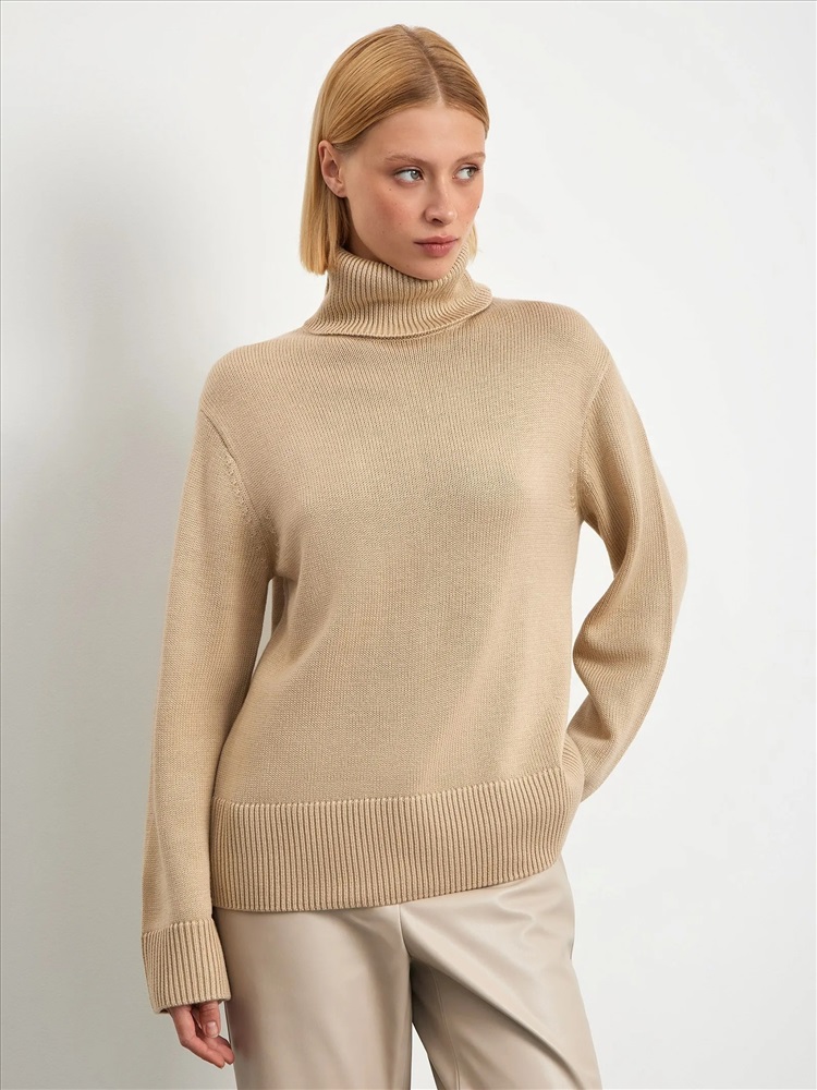 Базовый свитер в бежевом цвете. Модель прямого кроя актуально смотрится за счёт в меру свободной посадки, а также контраста между широкими полосами более крупной вязки резинкой и менее рельефной основной частью. Свободный рукав прикрывает кисть. Высокий ворот прилегает к горлу, но не плотно. Изделие выполнено из материала с содержанием шерсти.