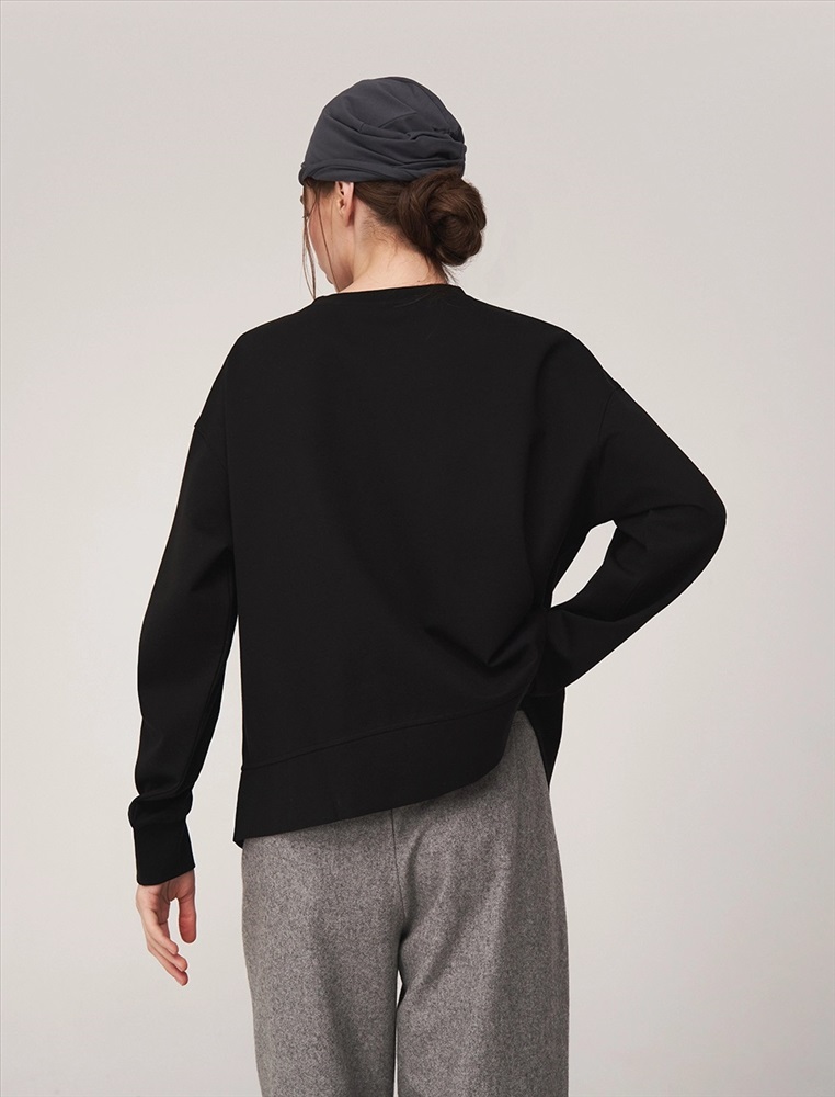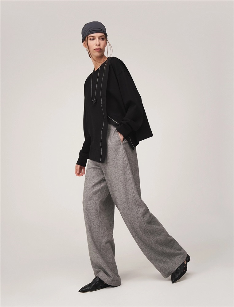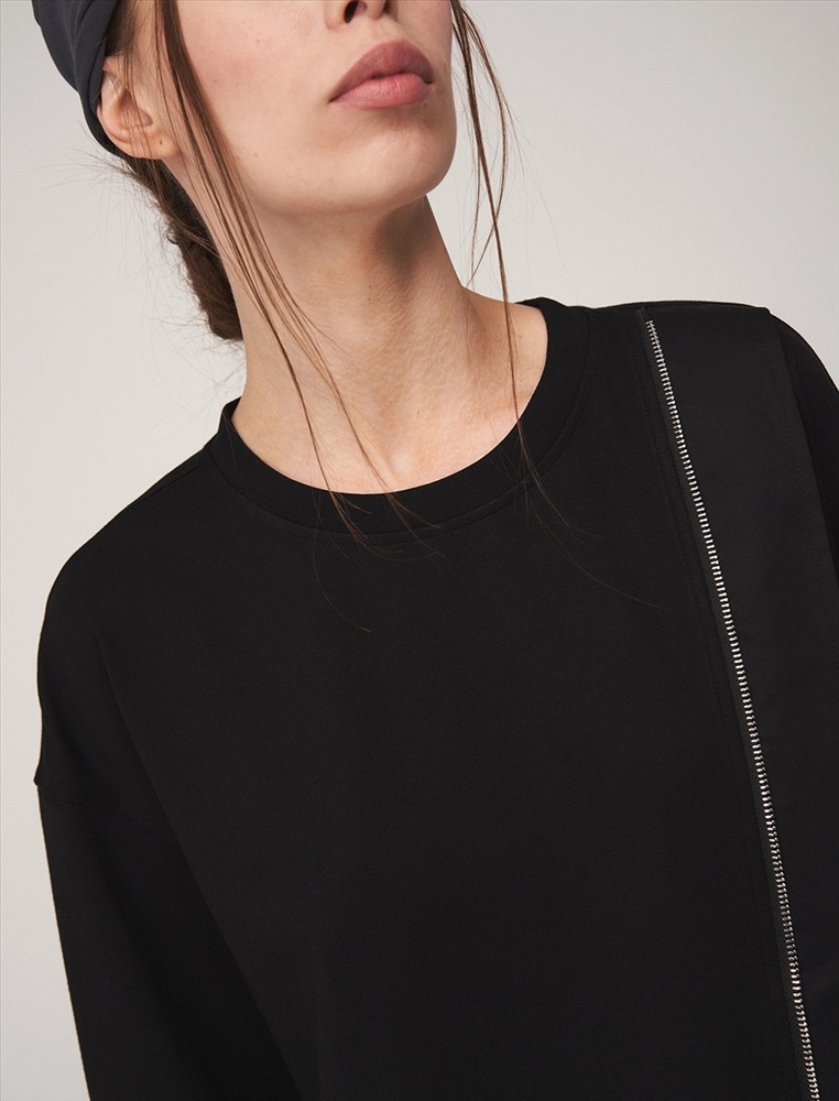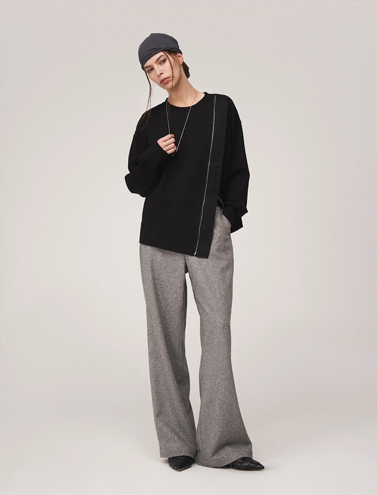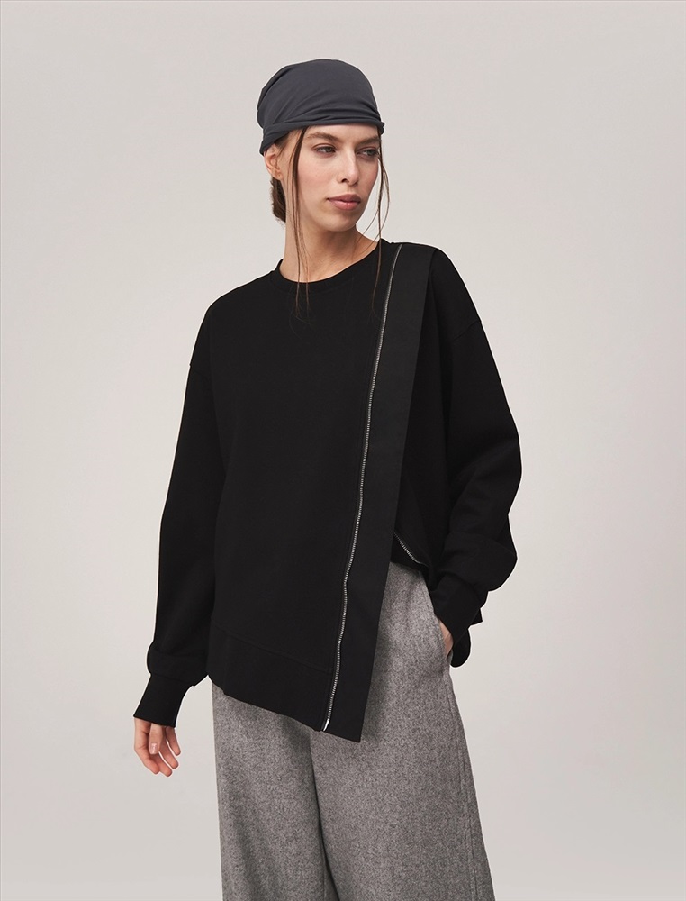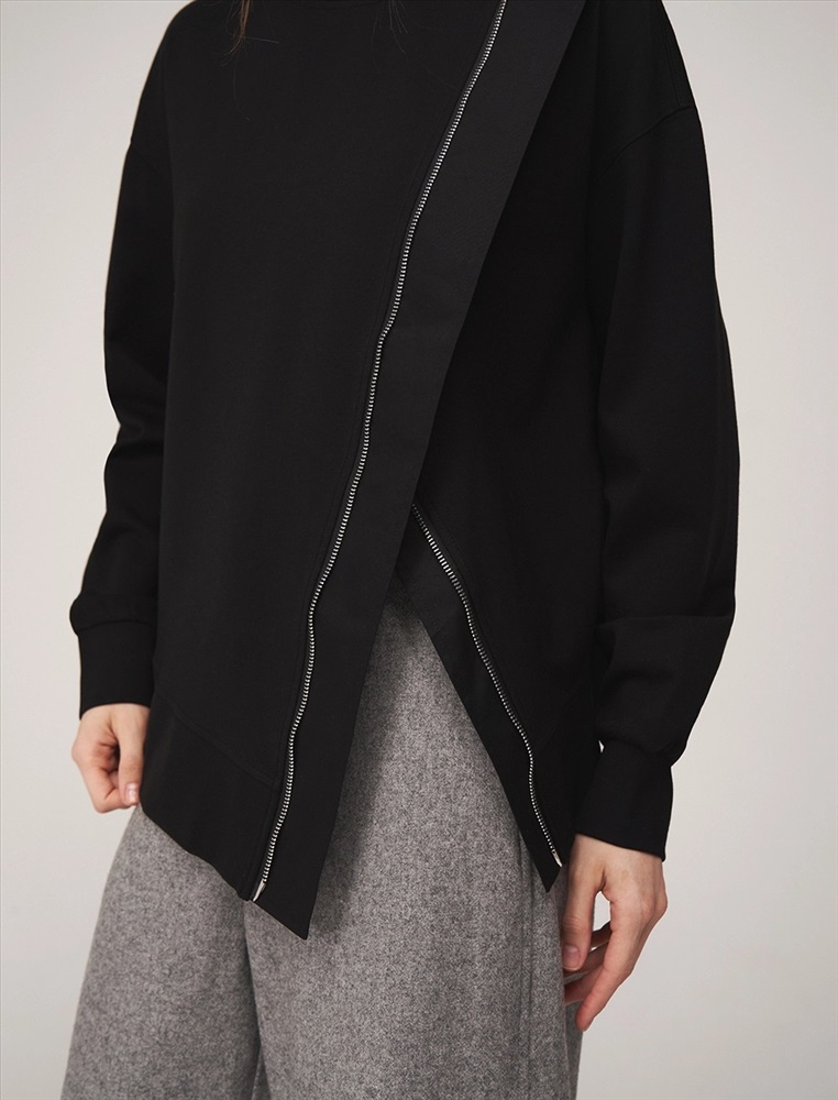 Видео: https-//hassfashion.ru/upload/iblock/6ec/9keh7wq31n52whphtzuqh5xy4mmsb40m.mp4 осень-зима А: 95% Хлопок, 5% Спандекс; В: 100% Хлопок Свитшот регулярного силуэта с круглой горловиной и спущенной линией плеча. По передней части изделия — имитация запаха с планкой из хлопка, вдоль которой расположена декоративная молния без пуллера. На манжетах и по низу — эластичная рибана. Ткань основы выполнена из хлопка с добавлением спандекса.