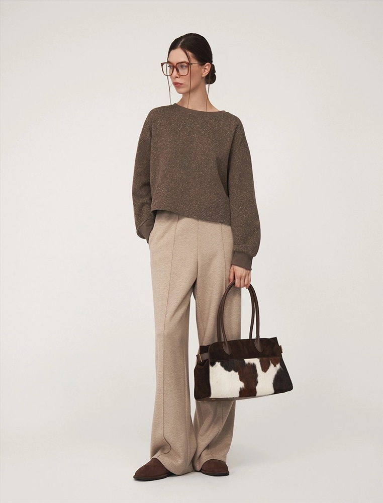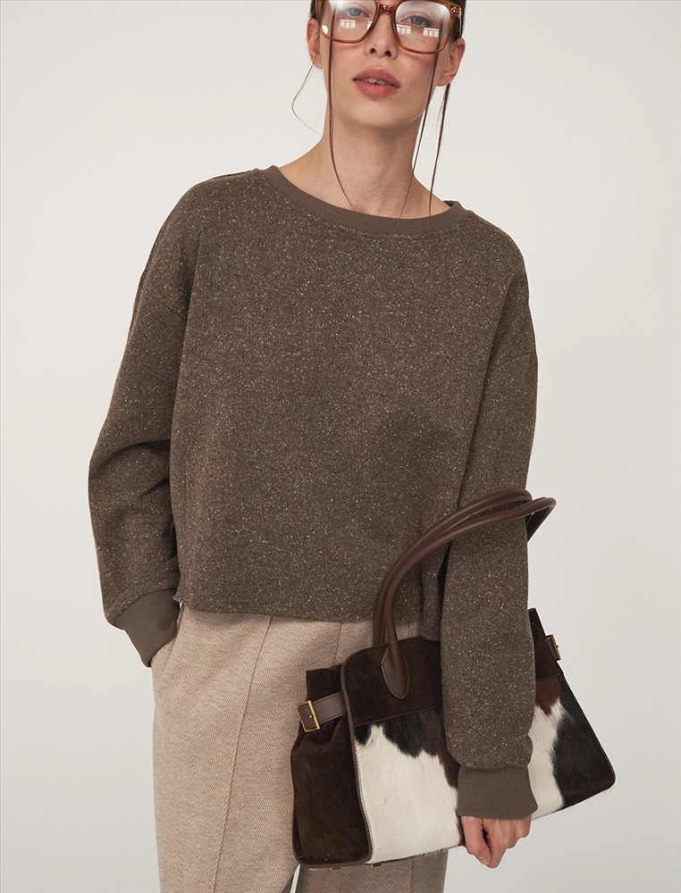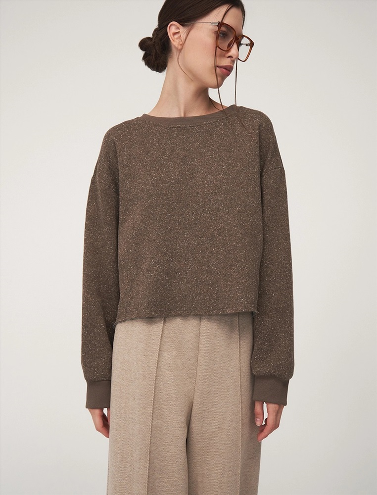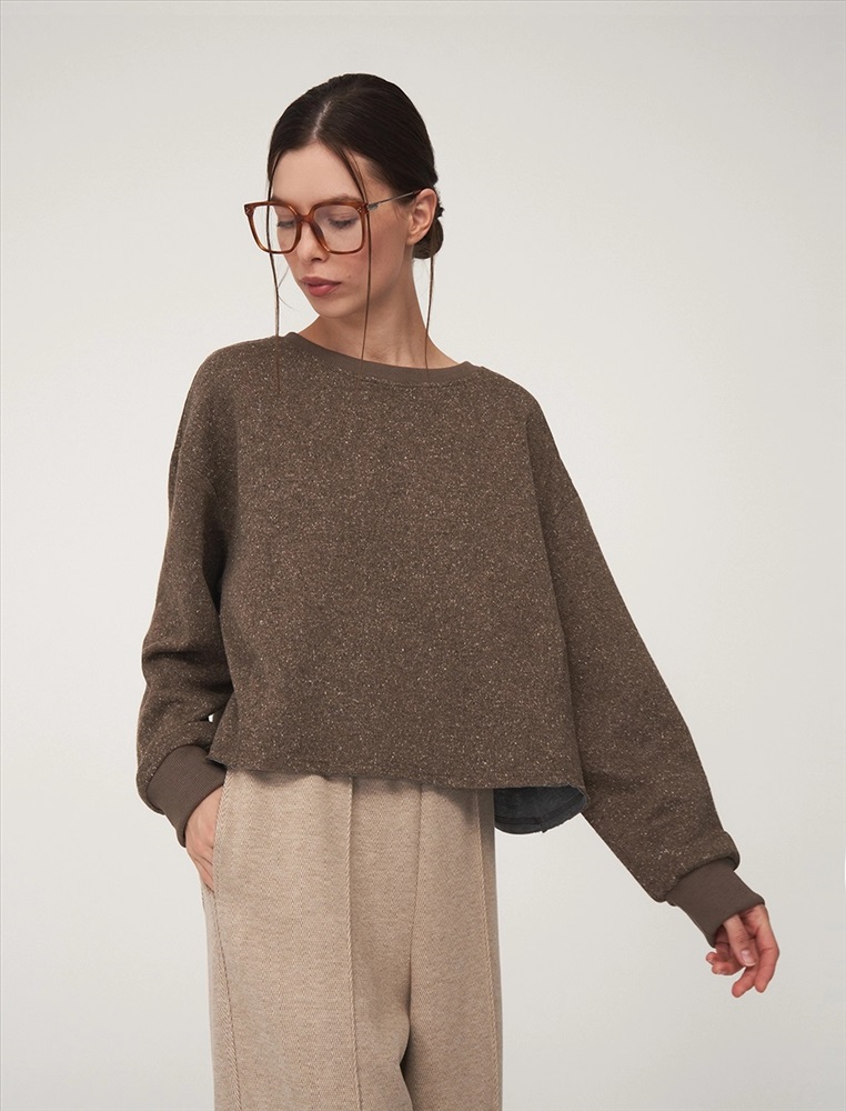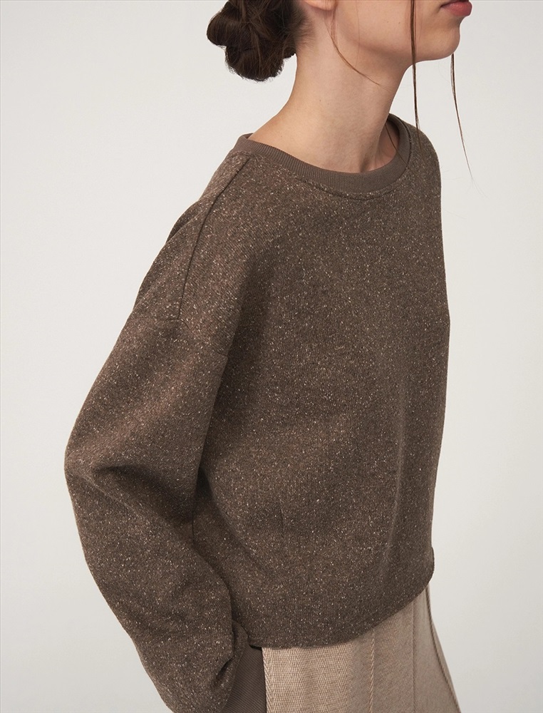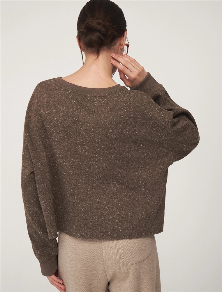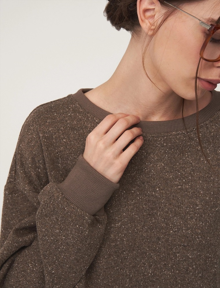 Джемпер регулярного силуэта с круглой горловиной и спущенной линией плеча. По манжетам и горловине эластичная рибана. По низу эффект необработанного края. Представлен в коричневом меланжевом оттенке. Выполнен из хлопка и акрила с добавлением полиэстера, что обеспечивает комфорт и долговечность.