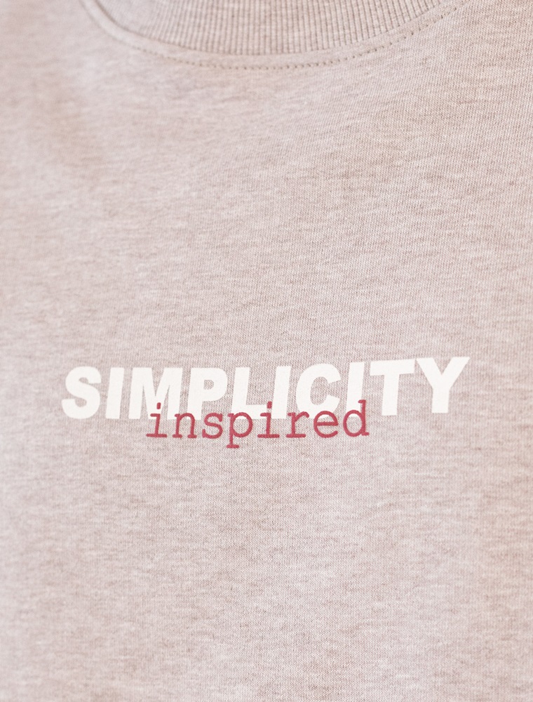 Свитшот выполнен из эластичного футера трехнитки-петля. Авторский принт нанесен фактурными красками с устойчивым покрытием. Перевод: Simplicity inspires - вдохновляясь простотой. Мягкая и очень удобная модель, не сковывающая движений, идеально подойдет для повседневного аутфита. Внизу изделия нашивка из эко-кожи с логотипом бренда.