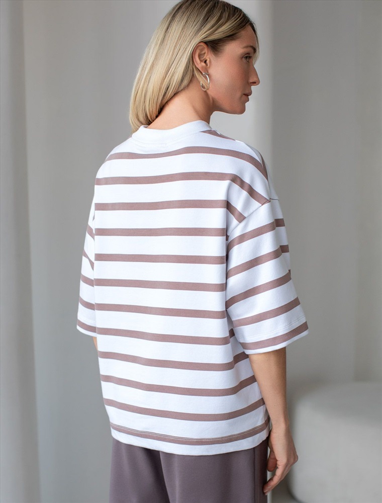 Параметры модели на первом фото: Рост 172, бюст 88, талия 64, бедра 88 Футболка свободного кроя выполнена из 100% хлопкового футера-двухнитки. Мягкий хлопковый трикотаж гарантирует комфорт даже в жаркое время года. Сочетается в костюме с любыми брюками из футера или джинсами. Комментарии к товару