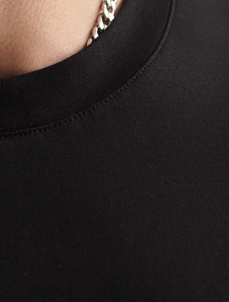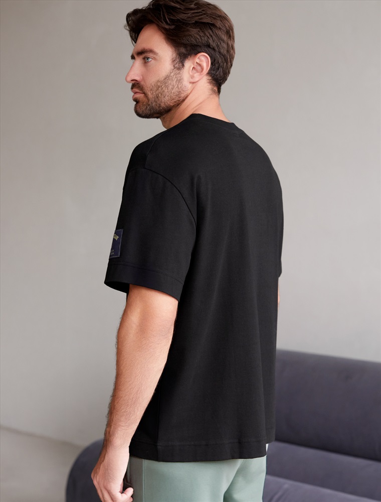 Стильная базовая футболка черного цвета выполнена из премиального хлопка с добавлением эластана для комфортной посадки. Модель отличается свободным кроем и спущенным рукавом, что придает образу легкость и непринужденность. Черный цвет делает изделие универсальным для различных сочетаний в повседневном гардеробе. Благодаря качественному материалу футболка сохраняет форму и цвет даже после многократных стирок, обеспечивая долговечность использования. Такой вариант идеально подходит для тех, кто ценит удобство без ущерба стилю, а также предпочитает одежду с акцентом на минимализм и практичность. Свободный крой позволяет свободно двигаться и не стесняет движений, что особенно важно в активном ритме жизни, а так же подходит для мужчин с разными предпочтениями и отлично смотрится как на стандартные, так и на большие размеры. Футболка дополнена нашивкой на руквае в виде надписи. Перевод надписи: The ocean spirit of deep blue - Океанский дух глубокого синего цвета. Эта базовая вещь станет надежной основой любого образа, дополняя как спортивные, так и повседневные луки.