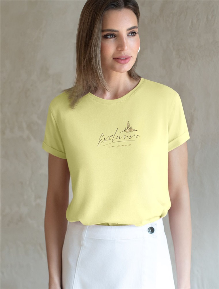 Плотность: 170 Г/м2 Модная футболка лимонного цвета привлекает внимание своим интересным дизайном и ярким принтом. Благодаря прямому крою изделие комфортно садится на любую фигуру, в том числе на большие размеры, и не сковывает движений. Круглый вырез подчеркивает современный стиль, а натуральный материал из хлопка с добавлением эластана обеспечивает удобство в повседневной носке и приятные тактильные ощущения. Прочность и износостойкая структура сохраняет первоначальную форму футболки после множества стирок. Рукава имеют аккуратные подгибы, что придает изделию завершенность и помогает сохранять аккуратный внешний вид. Принт надписи нанесен красками с устойчивым покрытием, перевод надписи: Exluzive moments collection only - Только коллекция эксклюзивных моментов. Стильная футболка гармонично вписывается в любой гардероб и подойдет для прогулок, отдыха дома или неформальных встреч. Благодаря особенностям кроя модель хорошо сидит, скрывая недостатки и подчеркивая достоинства. Удобная футболка идеально сочетается с базовыми вещами, позволяя создавать новые интересные образы каждый день. Комментарии к товару