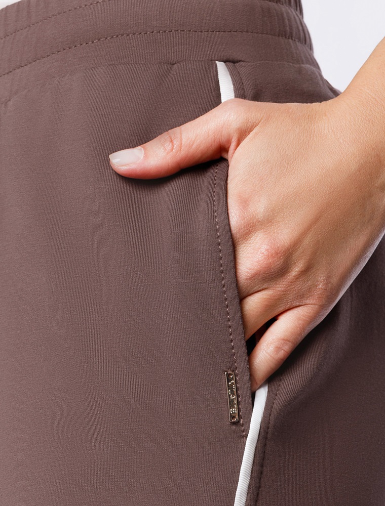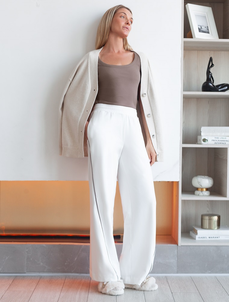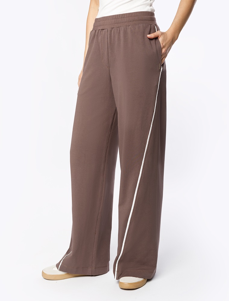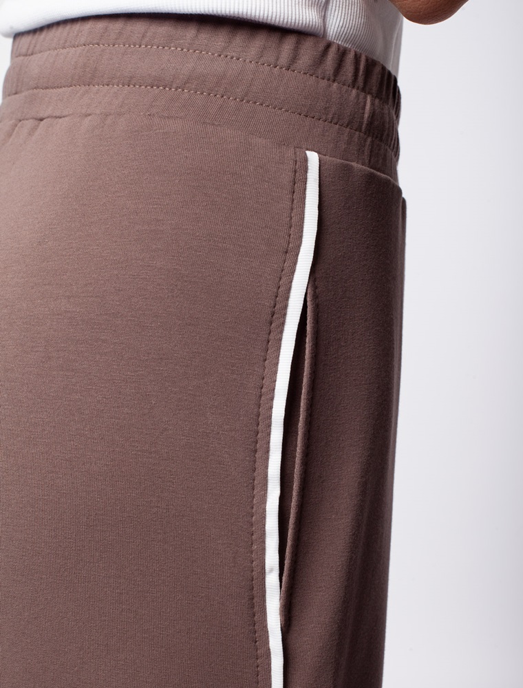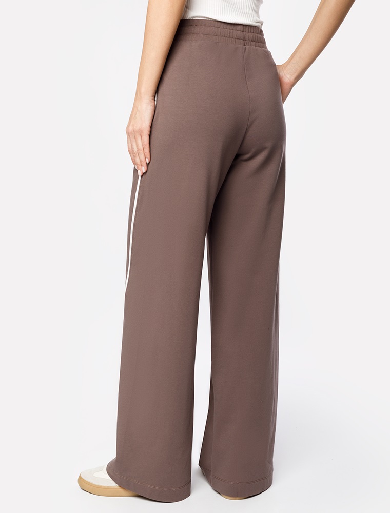 Брюки свободного кроя с контрастными лампасами выполнены из эластичного футера двухнитки. Модель дополнена боковыми карманами. Пояс на резинке фиксируется внутренним хлопковым шнуром. Диагональные визуально стройнят силуэт, а образ становится динамичным. Сочетайте изделие в костюме с паркой D49.076 и свитшотом D49.073