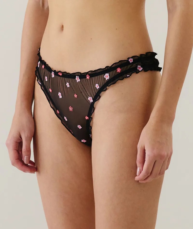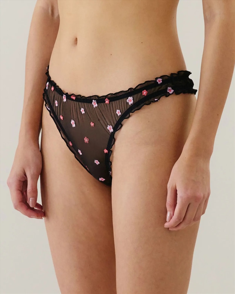 Descubre el tanga FIORDALIZ. Ligero y delicado, este tanga de tul transparente bordado combina finura y comodidad. Su juego de transparencias y sus detalles con volantes lo convierten en un imprescindible para un toque glamuroso en el día a día. Además: forma parte de nuestra gama We care.