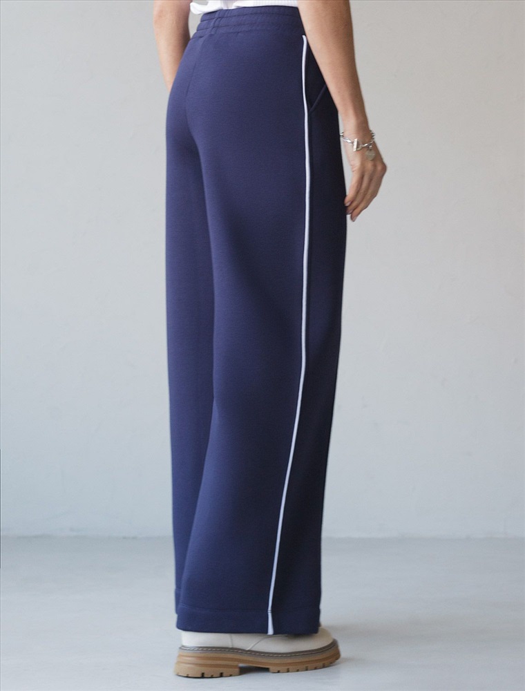 Теплые прямые брюки темно-синего цвета из эластичного футера трехнитки с начесом созданы для максимального комфорта в холодную погоду. Мягкий материал приятный к телу, хорошо держит форму, не вытягивается и не теряет форму даже при активной носке. Благодаря дышащим свойствам премиального футера, брюки подходят на любую погоду, обеспечивая оптимальный микроклимат и уют. Свободный крой и эластичный широкий пояс делает посадку удобной для разных типов фигуры и размеров, включая большие и маленькие. Застроченные стрелки визуально вытягиват силуэт и подчеркивают эстетичнось повседневных брюк, а контрастные тонкие лампасы добавляют актуальности образу. Благодаря особенностям трехниточного плетения и внутреннему слою с начесом, эти брюки отлично сохраняют тепло в холодные осенние и зимние дни, при этом в них вы будете выглядеть модно и современно. Вы можете составить комплект с артикулами: D49.143 и D49.142