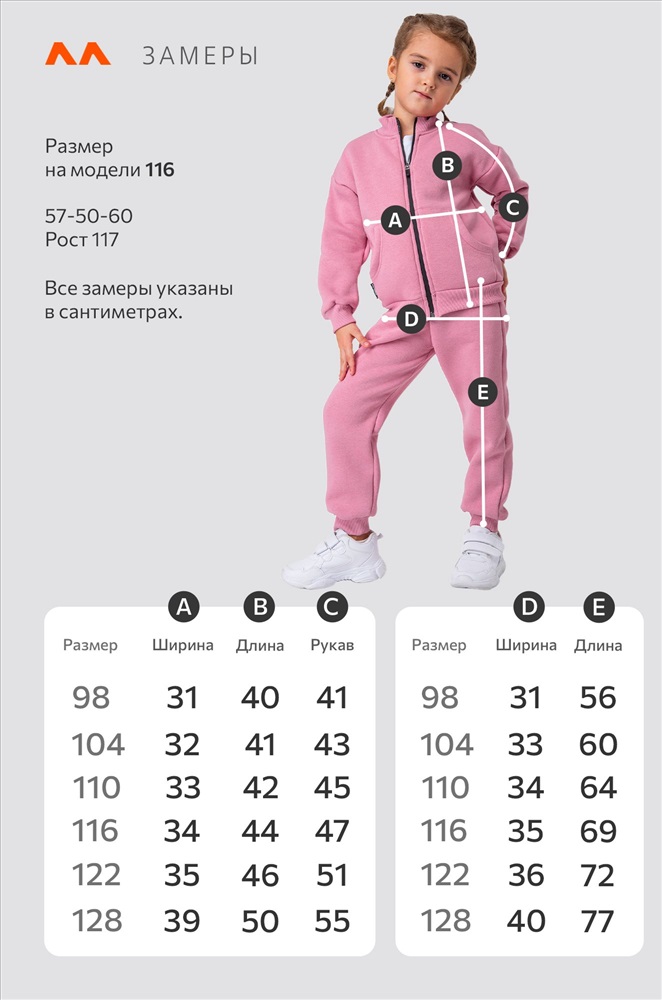 Размер 116: кофта: длина:44 см; ширина:34 см; длина рукава внешняя:47 см; длина рукава внутренняя:32 см.