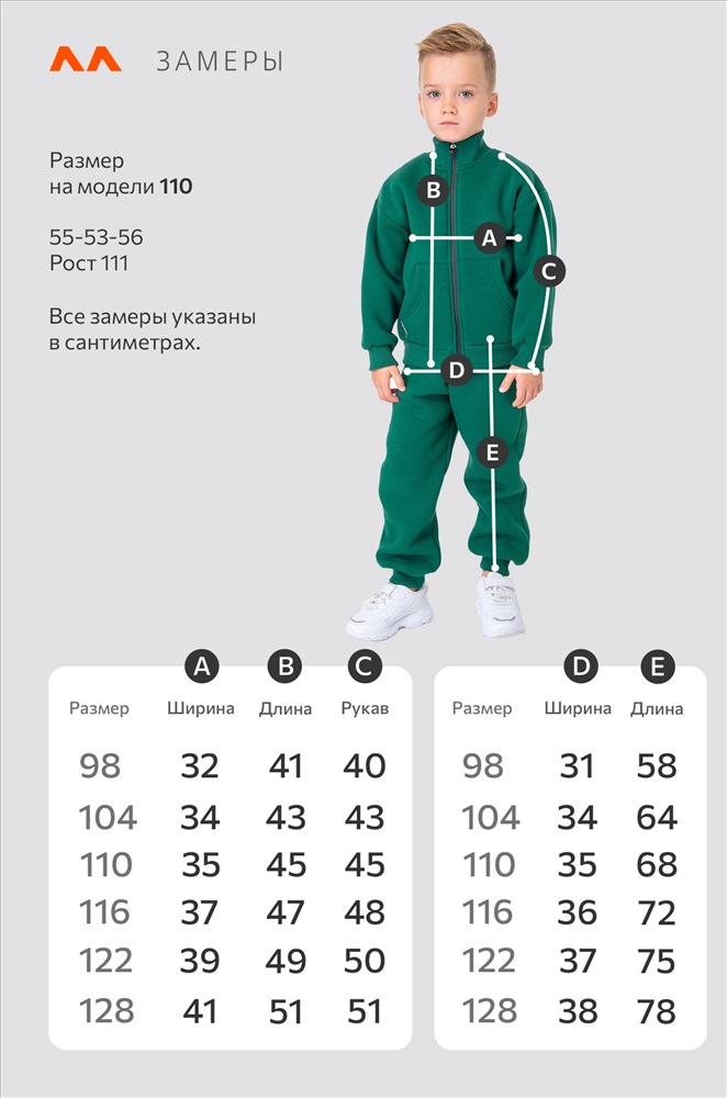 брючки: длина внеш. шва:58 см; длина внут. шва:39 см; ширина по бедрам:31 см. Размер 104: кофта: длина:43 см; ширина:34 см; длина рукава внешняя:43 см; длина рукава внутренняя:31 см. брючки: длина внеш. шва:64 см; длина внут. шва:41 см; ширина по бедрам:34 см. Размер 110: кофта: длина:45 см; ширина:35 см; длина рукава внешняя:45 см; длина рукава внутренняя:33 см. брючки: длина внеш. шва:68 см; длина внут. шва:45 см; ширина по бедрам:35 см. Размер 116: кофта: длина:47 см; ширина:37 см; длина рукава внешняя:48 см; длина рукава внутренняя:36 см. брючки: длина внеш. шва:72 см; длина внут. шва:49 см; ширина по бедрам:36 см. Размер 122: кофта: длина:49 см; ширина:39 см; длина рукава внешняя:50 см; длина рукава внутренняя:37 см. брючки: длина внеш. шва:75 см; длина внут. шва:50 см; ширина по бедрам:37 см. Размер 128: кофта: длина:51 см; ширина:41 см; длина рукава внешняя:51 см; длина рукава внутренняя:39 см. брючки: длина внеш. шва:78 см; длина внут. шва:54 см; ширина по бедрам:38 см. *замеры выборочные, могут незначительно отличаться. Комментарии к товару