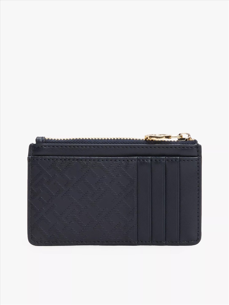 Tommy Hilfiger women's wallet. A textured monogram design defines this sleek cardholder, featuring a zip pocket and multiple card slots to keep your currency safe and secure.