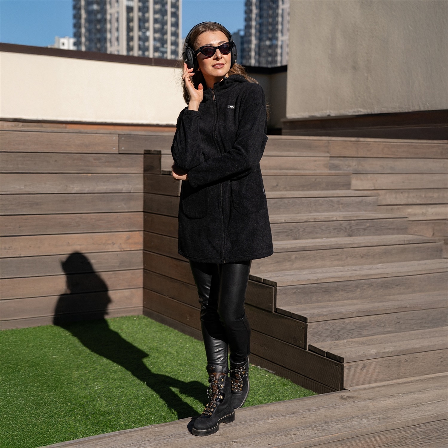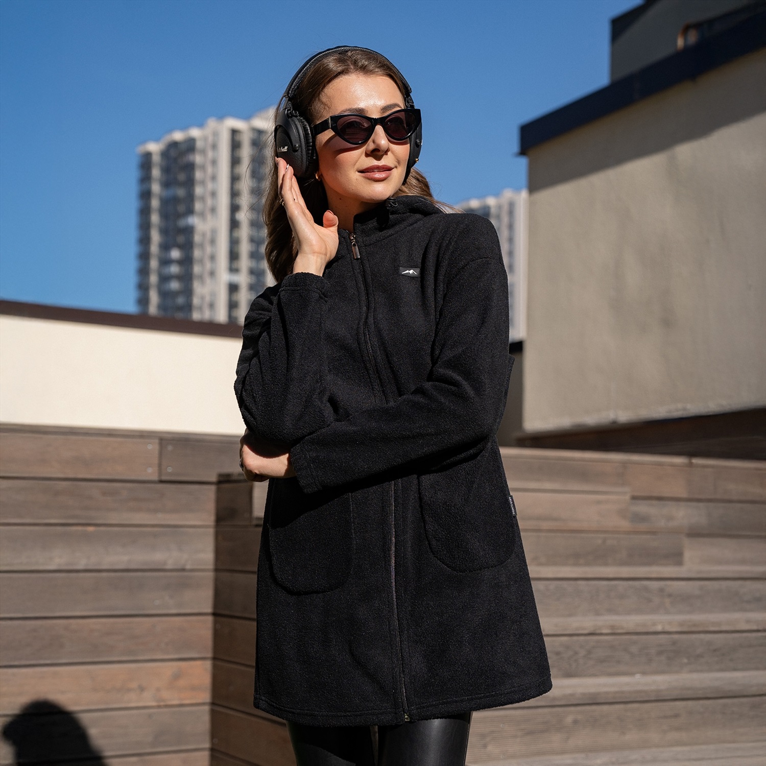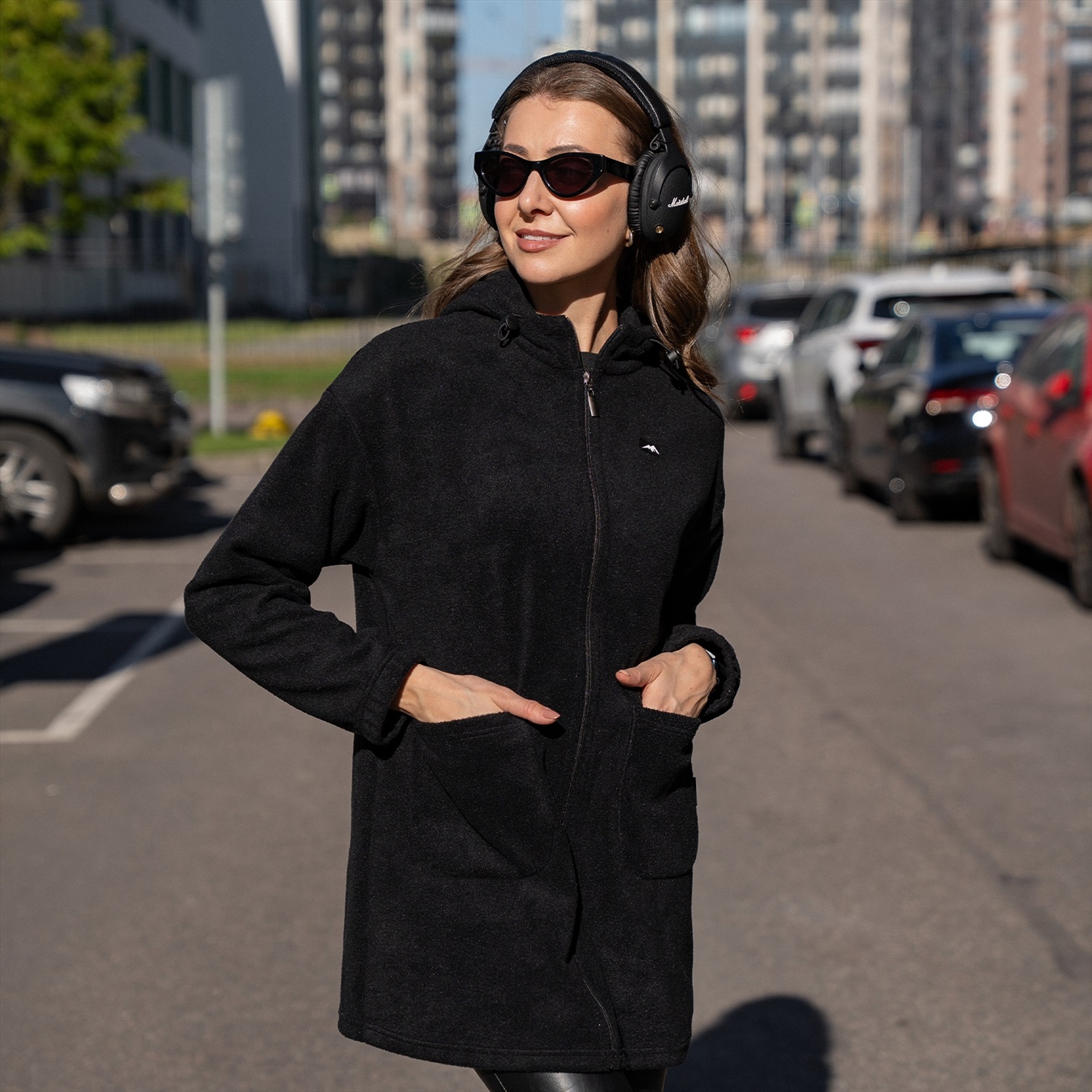 Женская удлиненная толстовка на молнии, с капюшоном и накладными карманами.Материал: French terry (soft) - футер 3-х нитка. Полотно с имитацией меха на лицевой поверхности и гладкой фактурой с изнаночной стороны. На ощупь - плотный, мягкий, комфортный материал. Хорошо держит форму и имеет способность согревать и сохранять тепло. Не мнется, прост в уходе, долговечен, не оставляет ворс на одежде. ВНИМАНИЕ: В стирке требует более бережного обращения. Рекомендуется утюжить и стирать вывернутыми на изнаночную сторону при температуре 30 градусов.Состав: 70% Cotton 30% Polyester