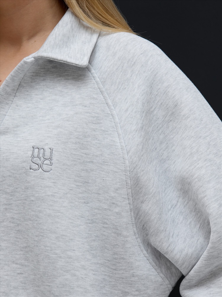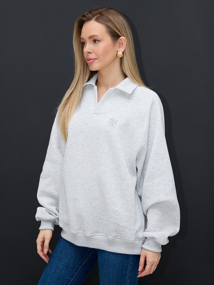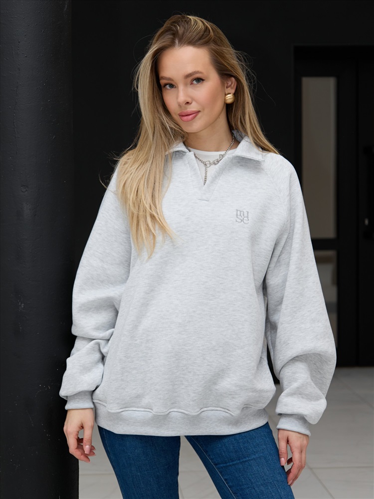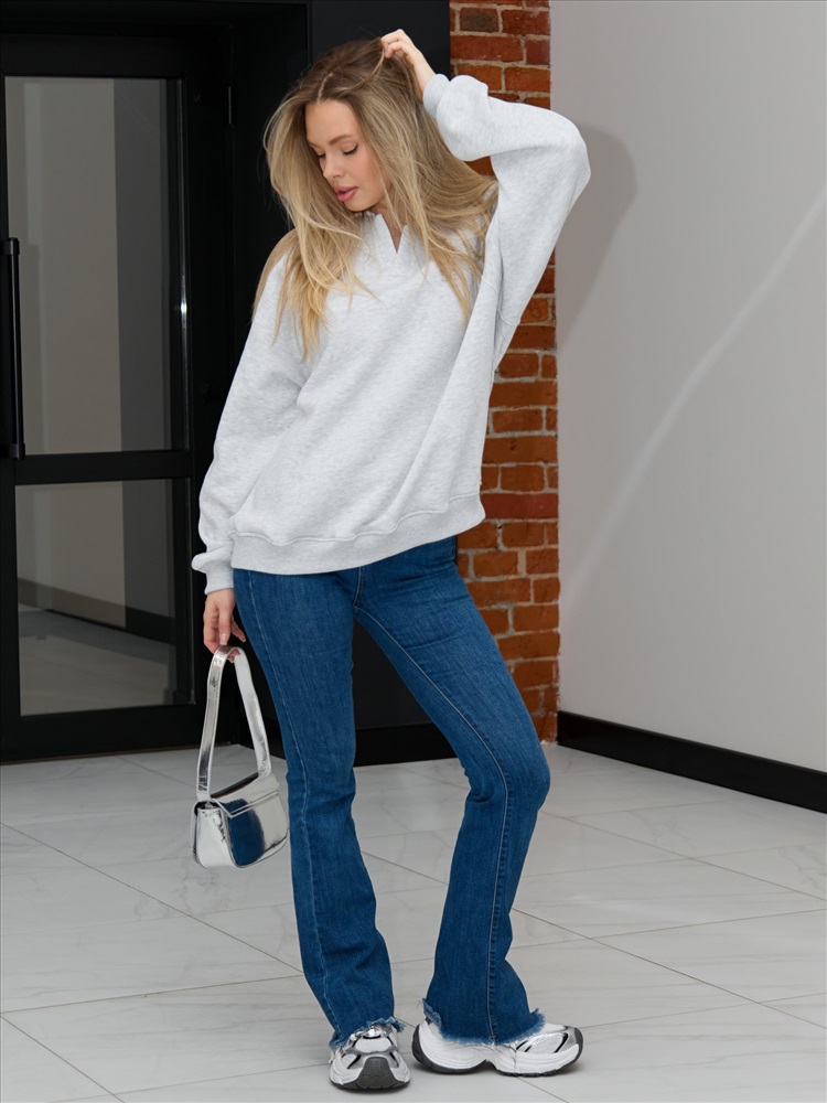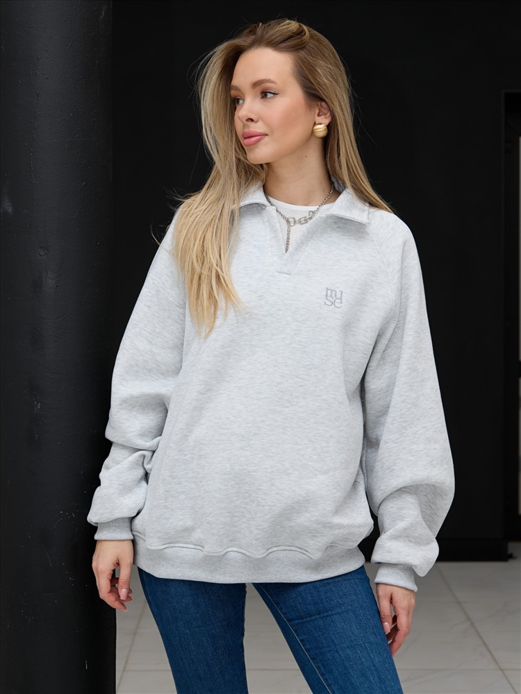 Ткань: Футер 3-х нитка с начесом Толстовка женская из трикотажного полотна "кармеланж" с отделкой из полотна "кашкорсе", оверсайз, с рукавами покроя "реглан", стояче-отложным воротником и V-образным вырезом горловины, обработаннм втачными планками и вышивкой на детали переда. Притачной пояс по низу изделия и манжеты рукавов выполнены из полотна "кашкорсе" в цвет основого материала. По воротнику, швам реглана и шву притачивания пояса настрочены отделочные строчки.