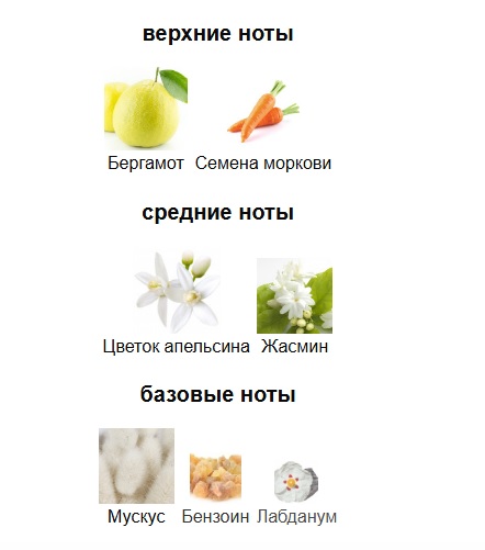 Верхние ноты: Бергамот и Семена моркови; средние ноты: Цветок апельсина и Жасмин; базовые ноты: Мускус, Бензоин и Лабданум.
