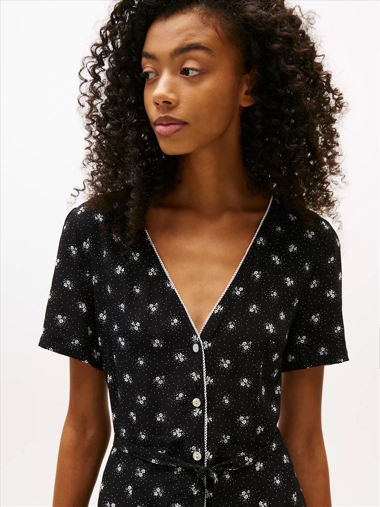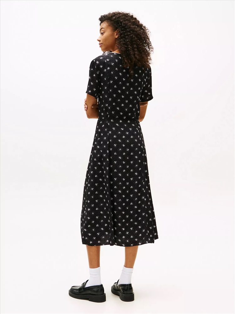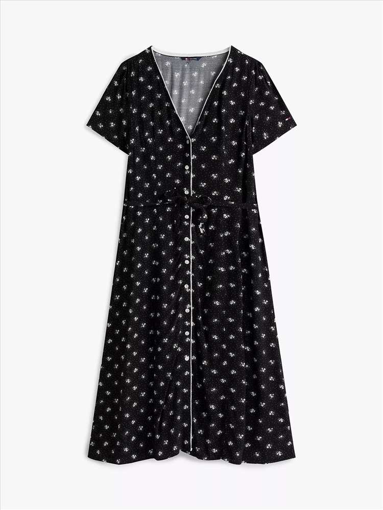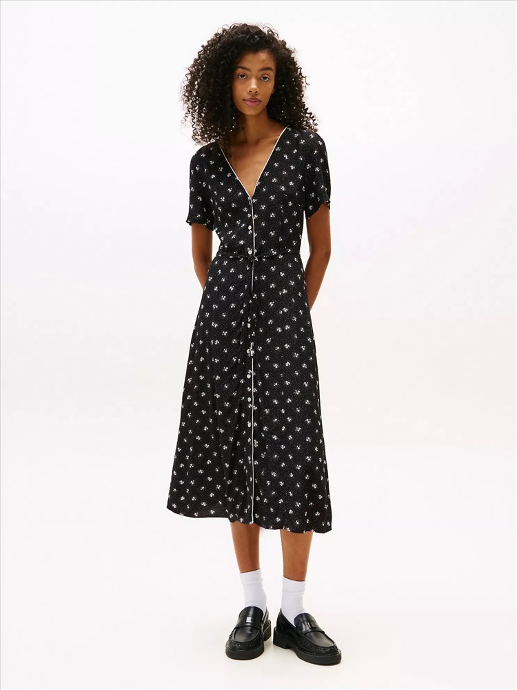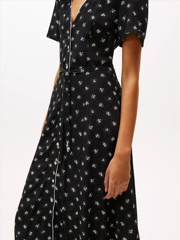 Tommy Hilfiger women's dress. This floral midi dress is both playful and polished, thanks to the midi silhouette, button-closure design and flattering self-tie belt at the waist. Made from breezy viscose, it has a smooth, lightweight feel. Part of our Tommy Jeans collection.