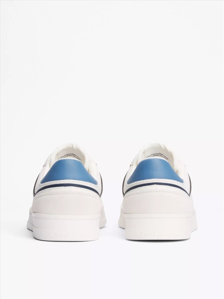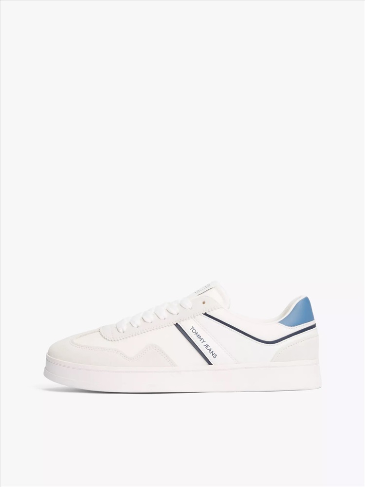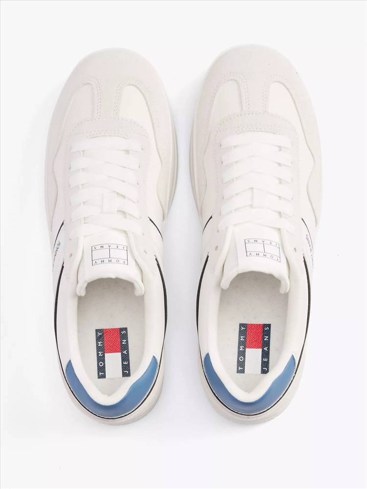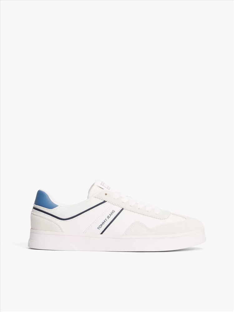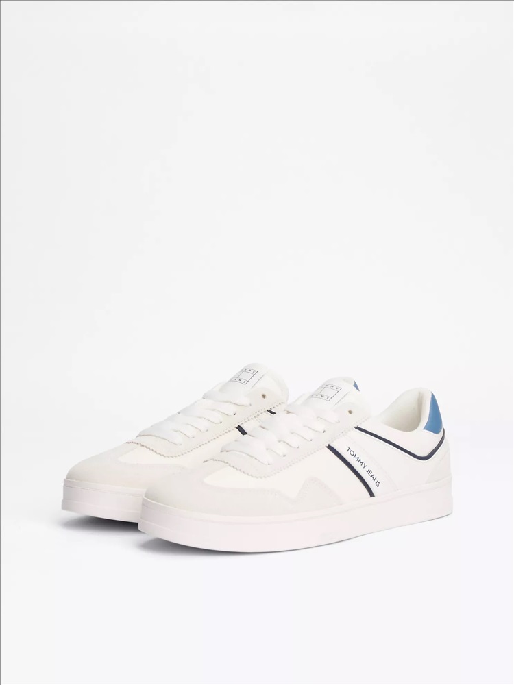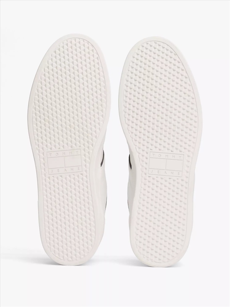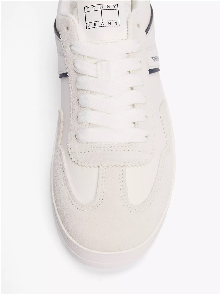 Tommy Hilfiger women's sneaker. Fusing retro-inspired spirit with a streamlined silhouette, these leather sneakers feature a mixed-texture finish. Part of our Tommy Jeans collection.