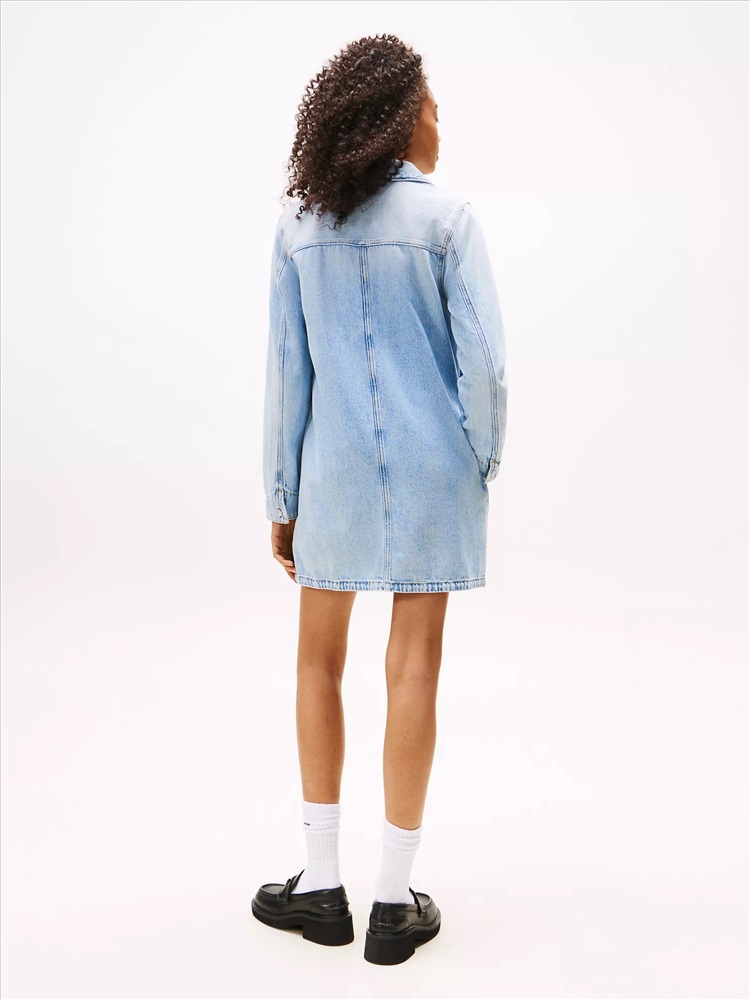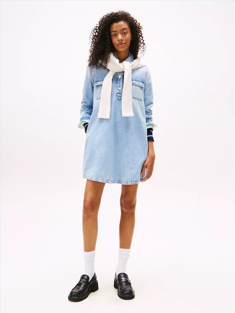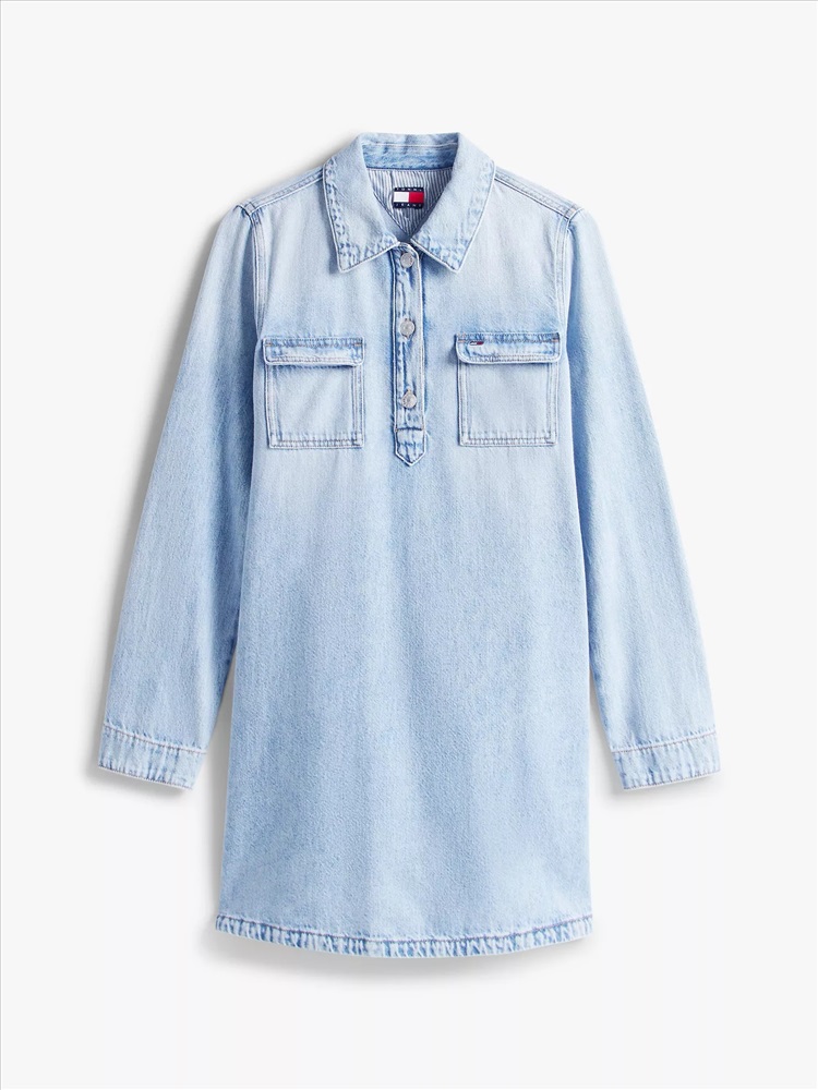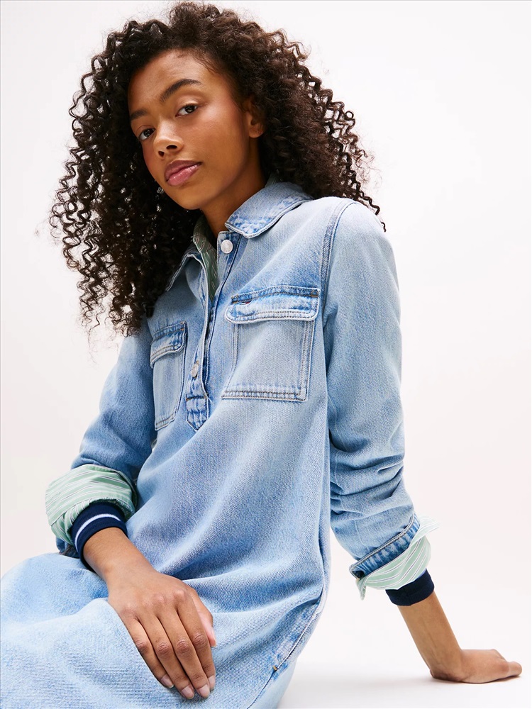 Tommy Hilfiger women's dress. Made from premium cotton denim, this versatile shirtdress is cut in a flattering A-line silhouette. Paired with your favorite footwear, you're ready for the day. Part of our Tommy Jeans collection.