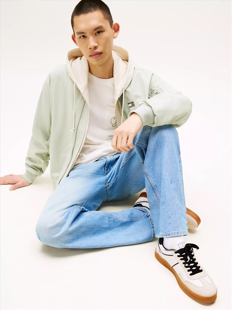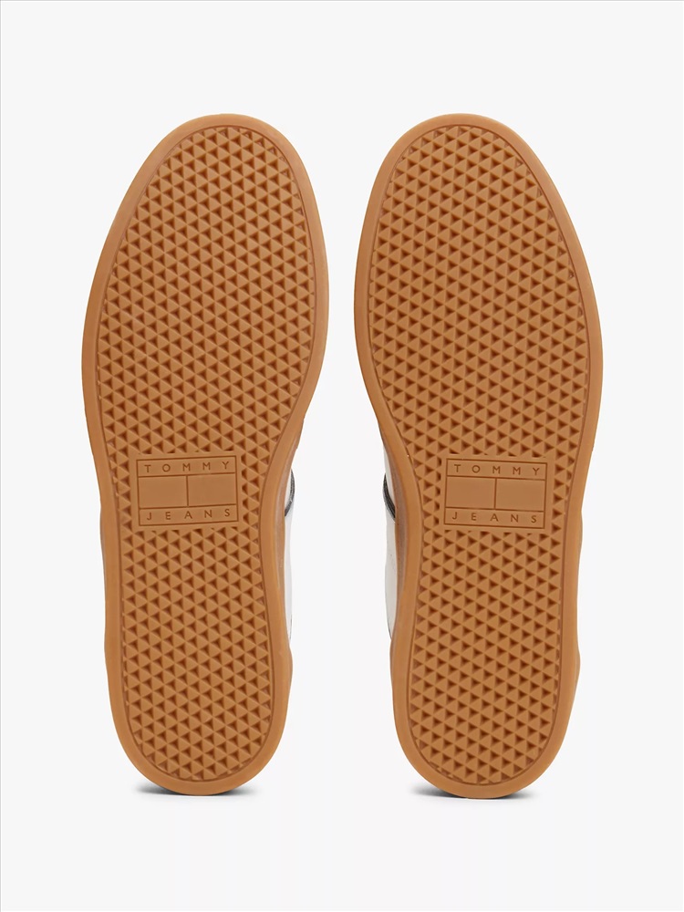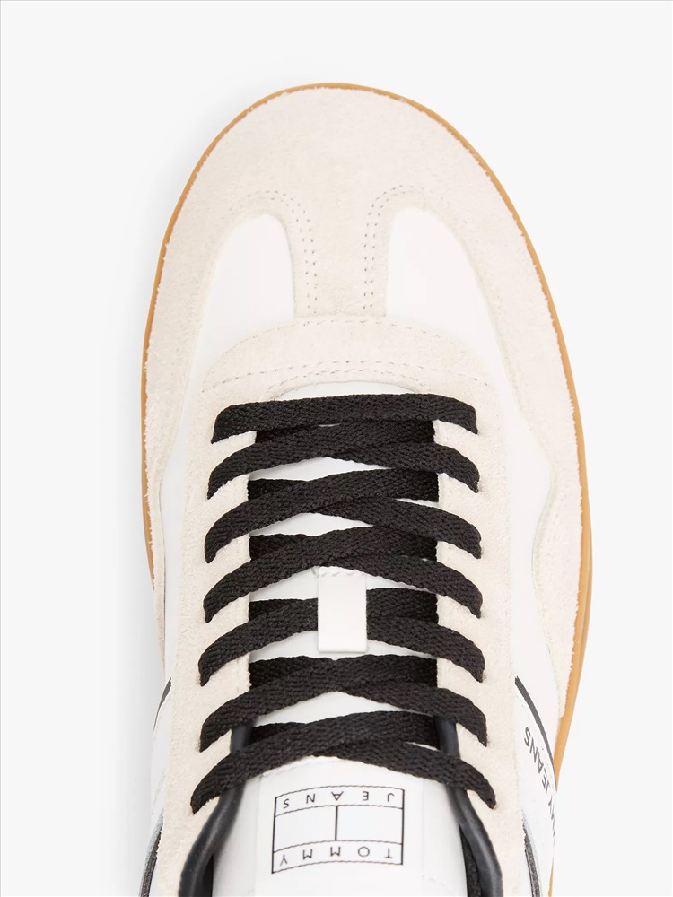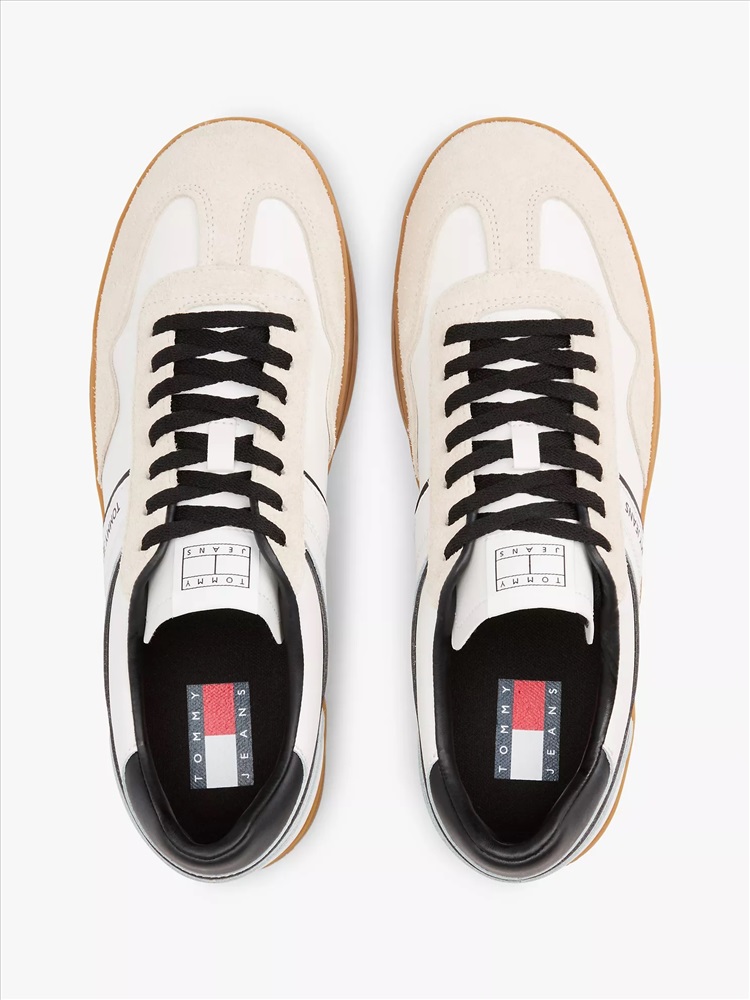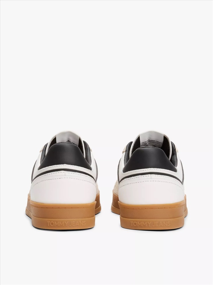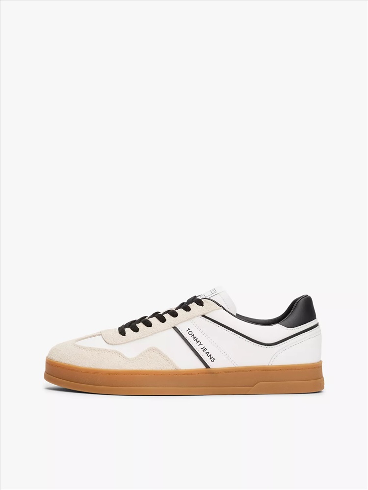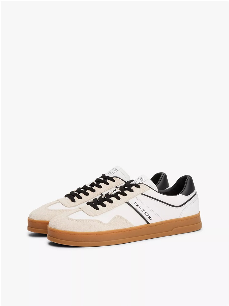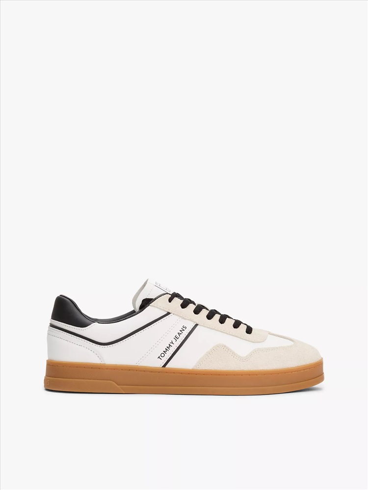 Tommy Hilfiger men's sneaker. These sleek lace-up leather-mix sneakers are designed with a distinctive mix of textures at the vamp. Made for easy-going weekends, this versatile pair goes with most everything in your casual wardrobe. Part of our Tommy Jeans collection.