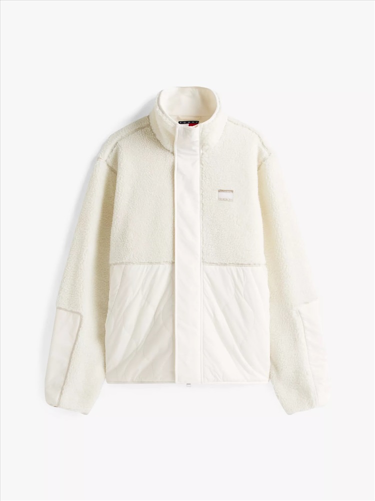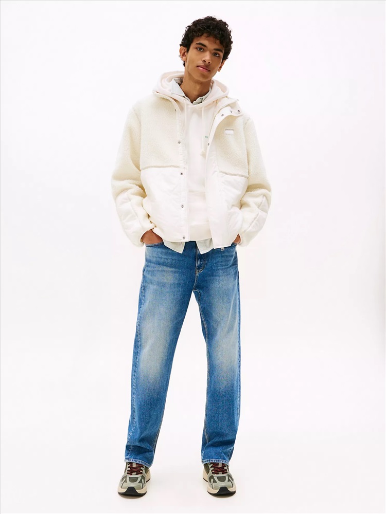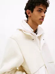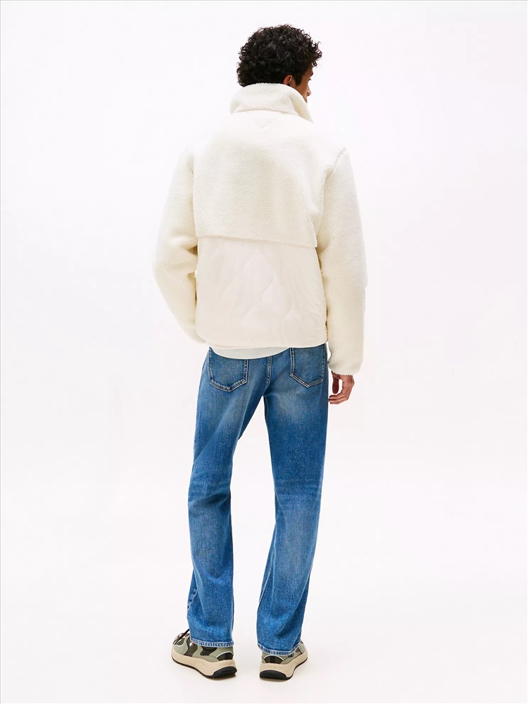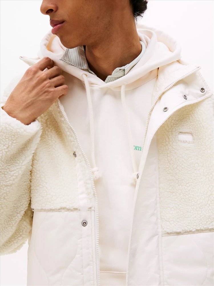 Tommy Hilfiger men's jacket. Ideal for the changing seasons, this relaxed-fit jacket combines a plush teddy finish with quilted panels for warmth when the temperature drops. Part of our Tommy Jeans collection.