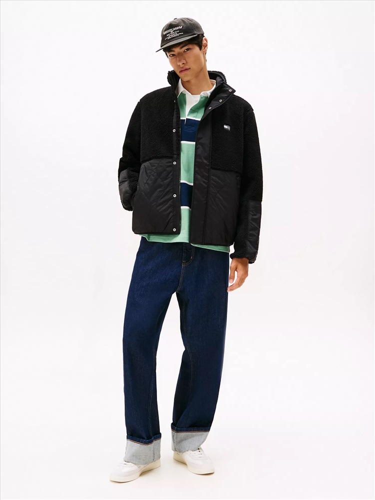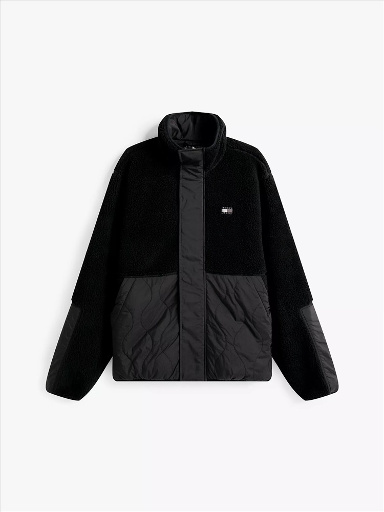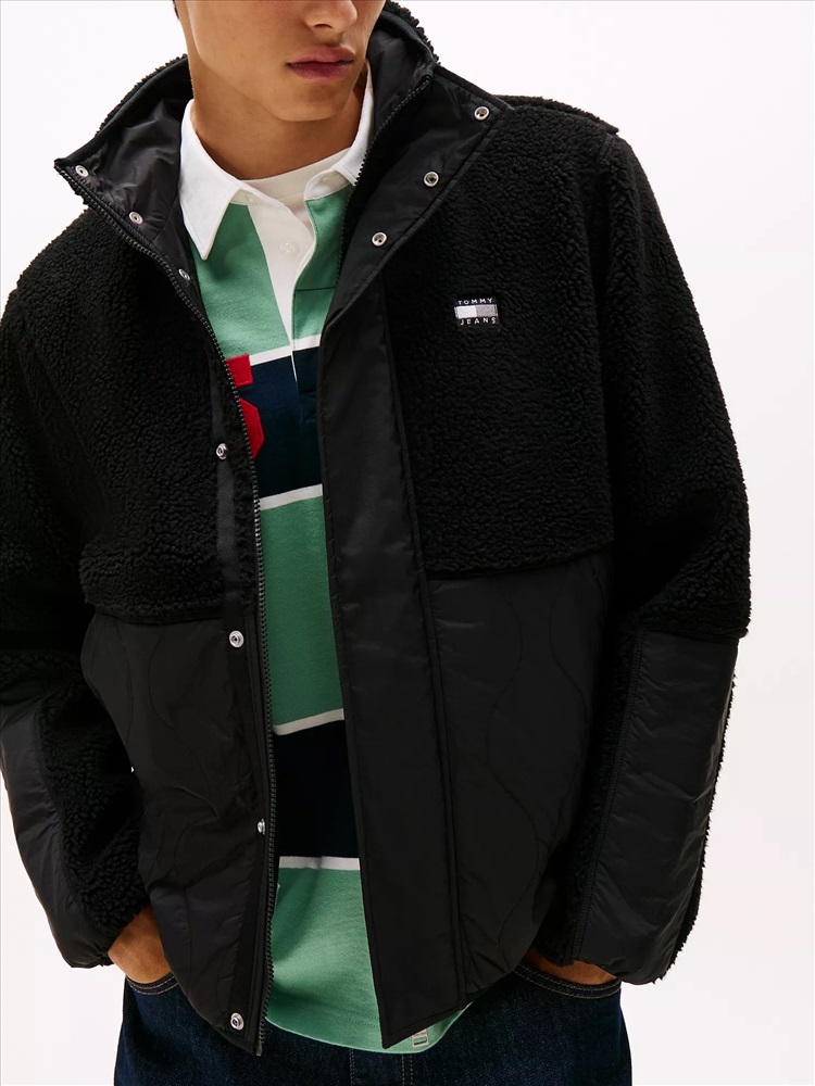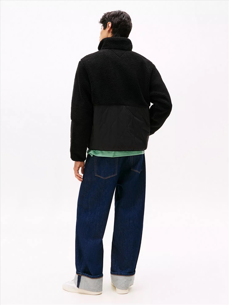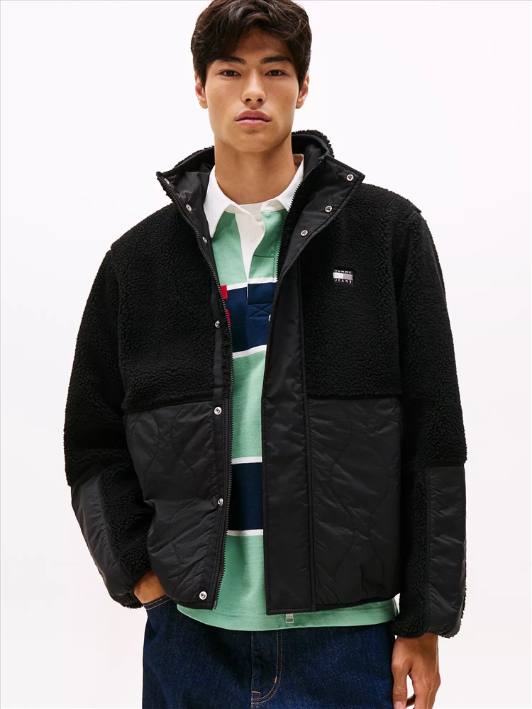 Tommy Hilfiger men's jacket. Ideal for the changing seasons, this relaxed-fit jacket combines a plush teddy finish with quilted panels for warmth when the temperature drops. Part of our Tommy Jeans collection.