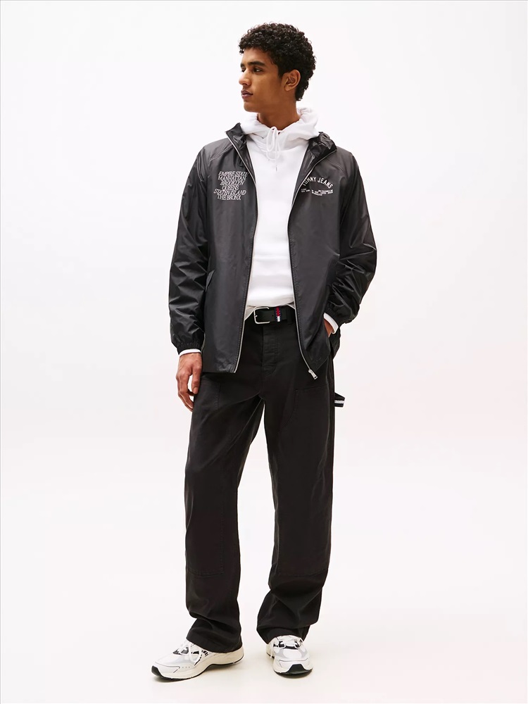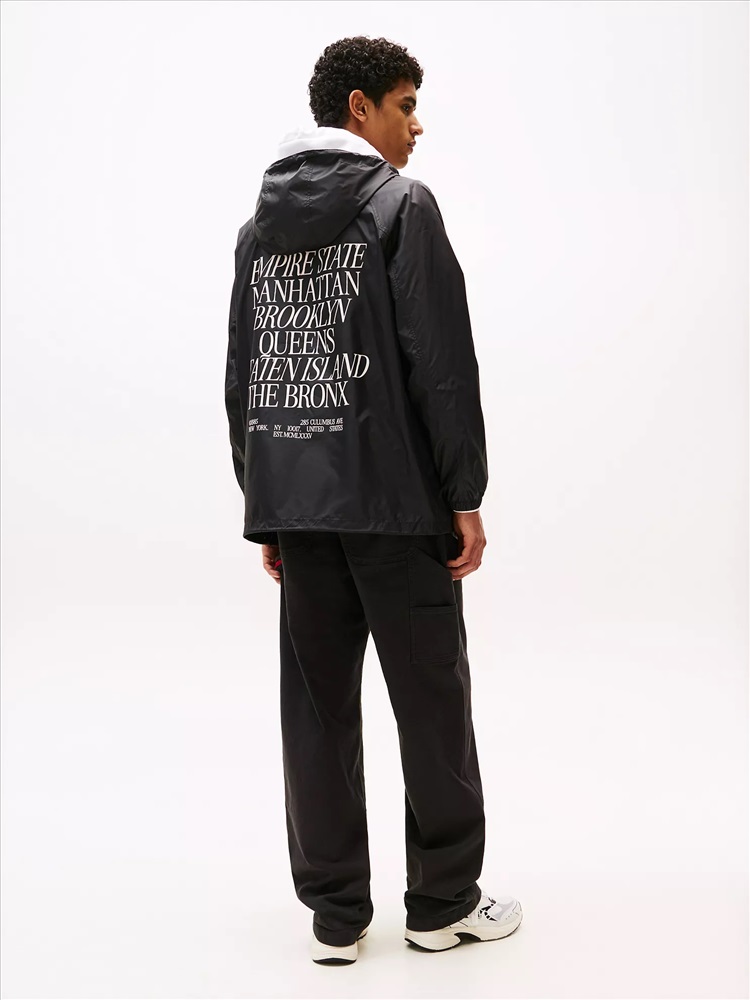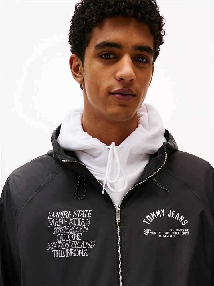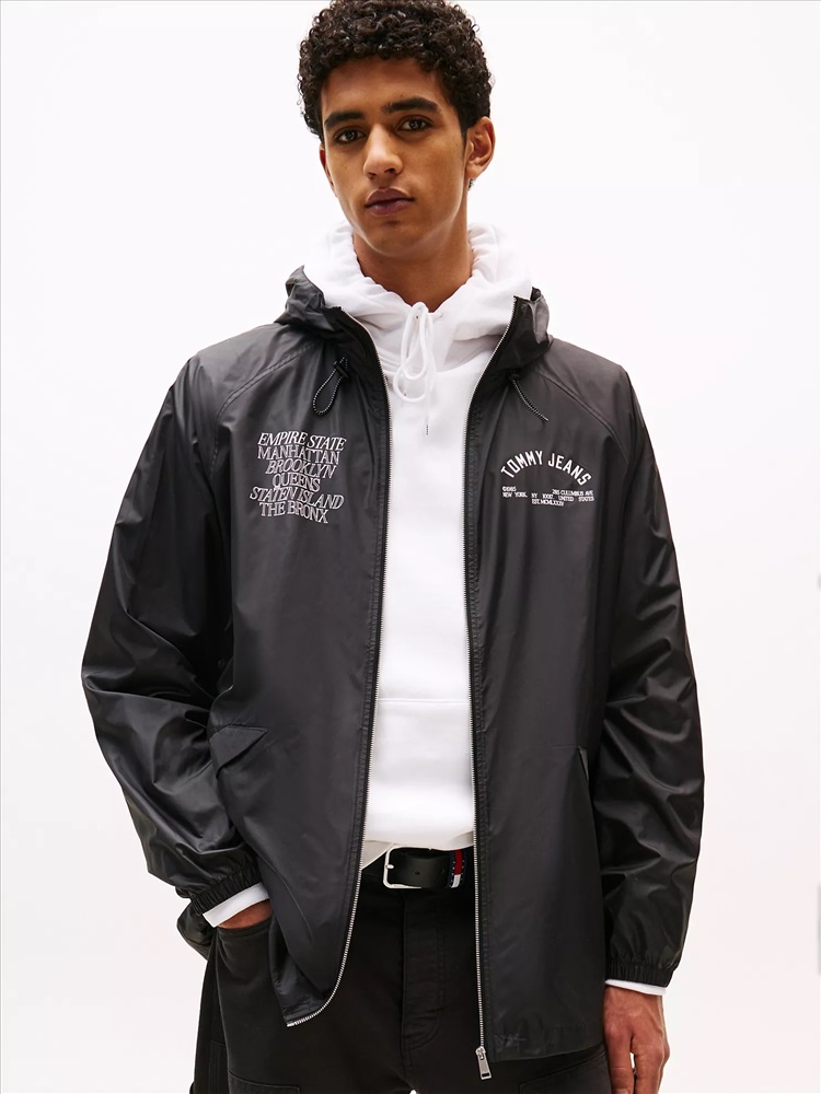 Tommy Hilfiger men's jacket. Our lightweight hooded windbreaker protects against the elements. Staying true to our East Coast roots, this version nods to the five boroughs with a fresh take on the logo. Part of our Tommy Jeans collection.