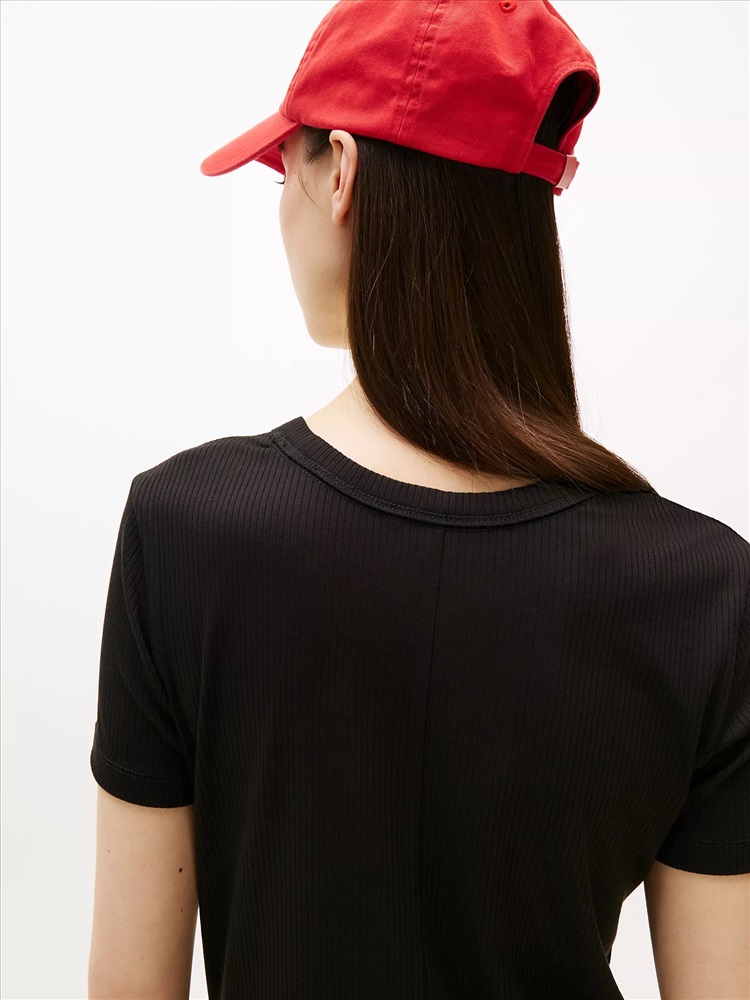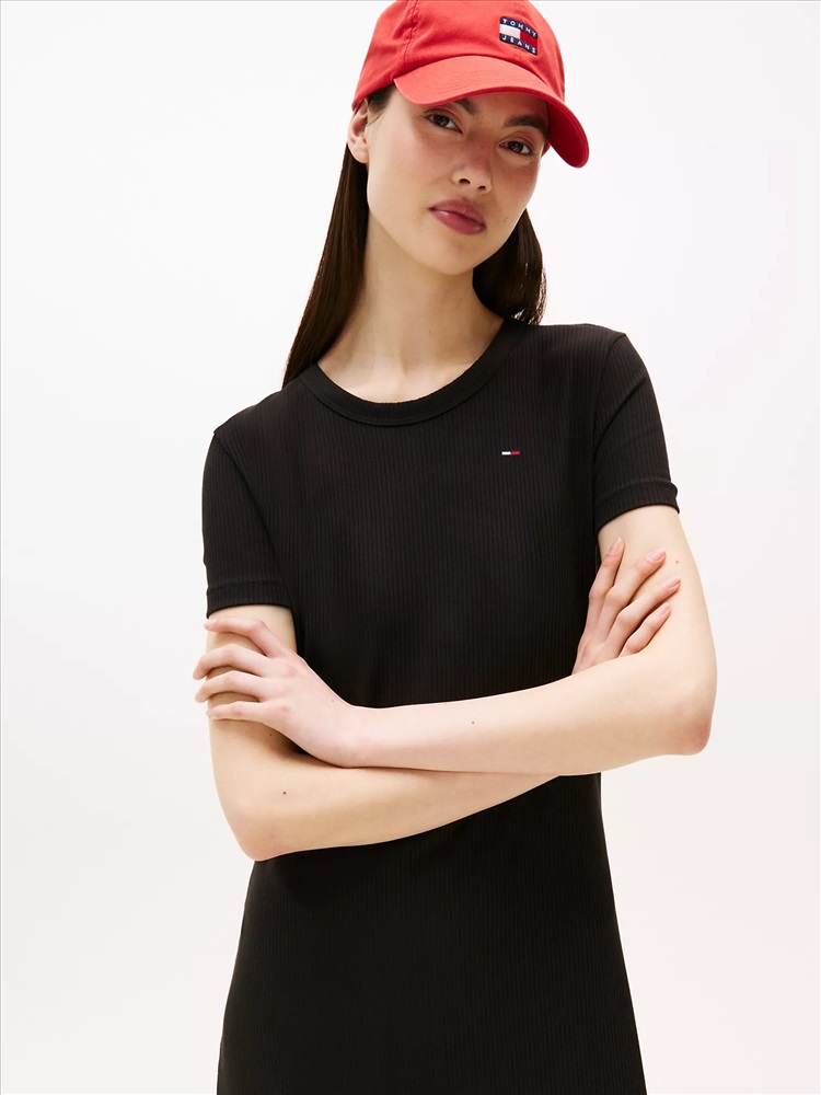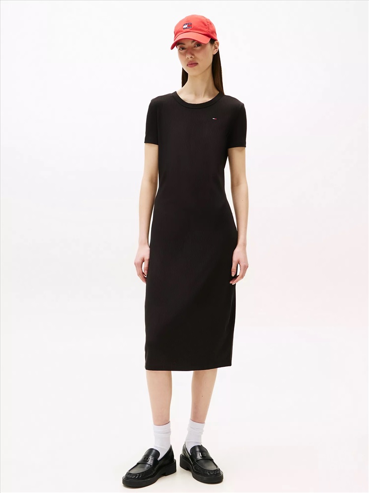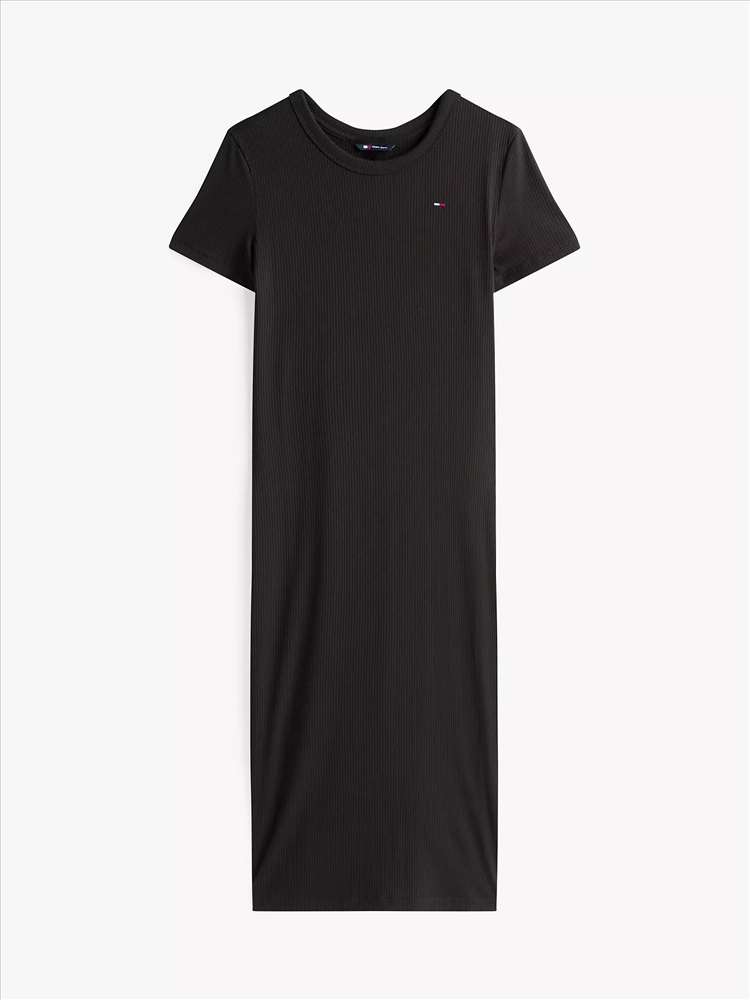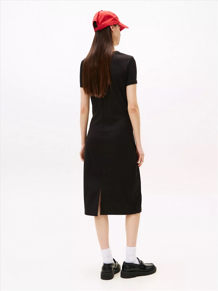 Tommy Hilfiger women's dress. Our sleek dress is made from a comfortable, stretchy ribbed knit. Designed with short sleeves, this versatile midi has a casual, breezy feel. Part of our Tommy Jeans collection.