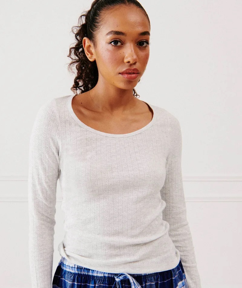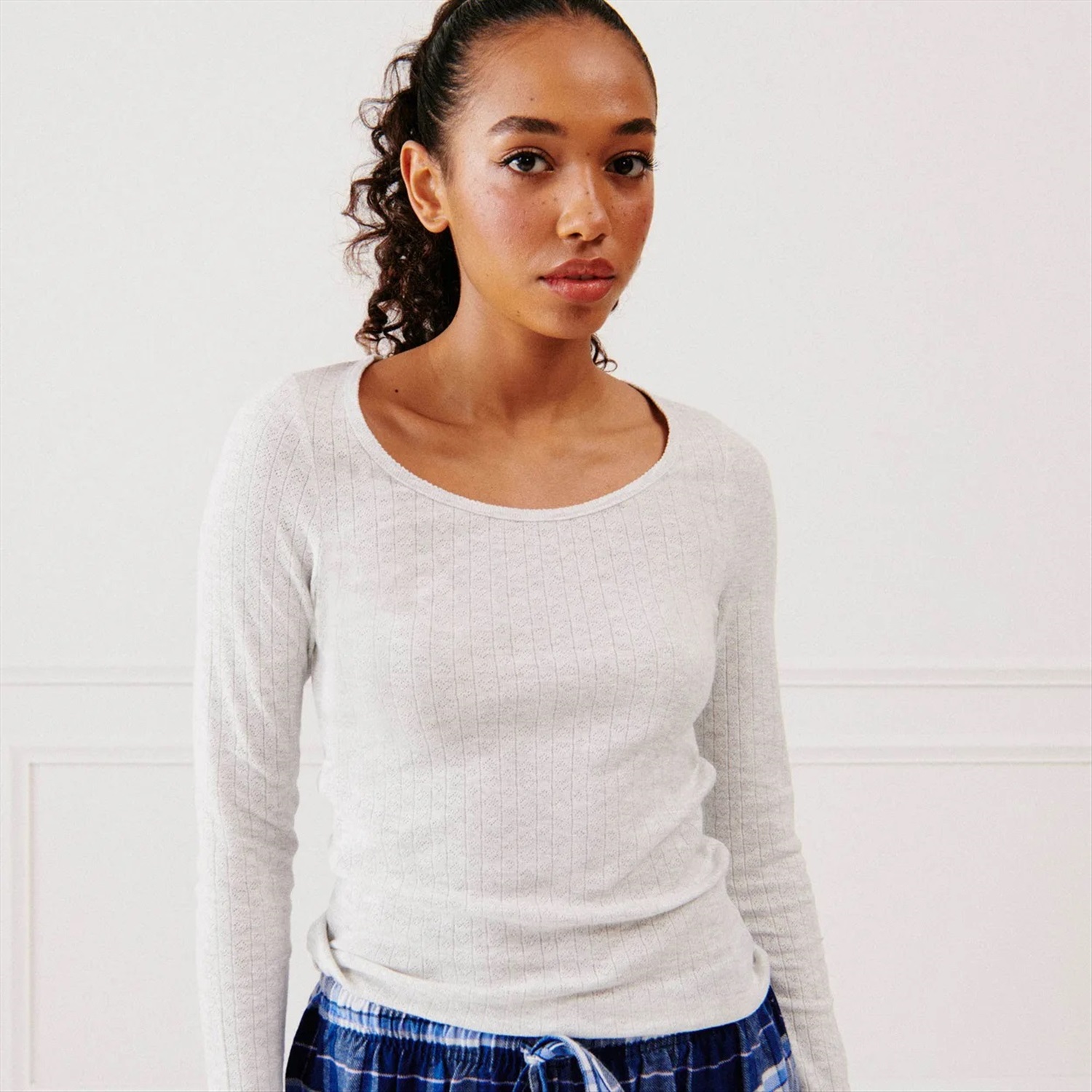 Descubre este icónico top de manga larga calado. El calado le confiere al top BLOSSOMIZ un aspecto moderno y actual para relajarse en casa o para llevar como pijama. El detalle que añade valor a este top es el cuello con un bonito detalle de picos que lo hace muy mono. Combina este top con el pantalón y las zapatillas BLOSSOMIZ para conseguir un look moderno y acogedor. ?