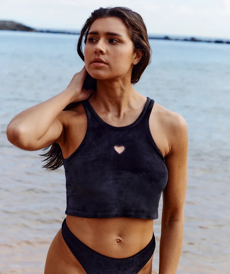 Enamórate de nuestro top HEARTSUNIZ. Este crop top de terciopelo, con un bonito detalle de corazón recortado en el centro, atraerá todas las miradas. Su diseño escotado es genial para las amantes de la moda. Ten en cuenta que este top ha sido pensado para gustar tanto a las chicas como a los chicos. Además, forma parte de nuestra \ngama «We Care».
