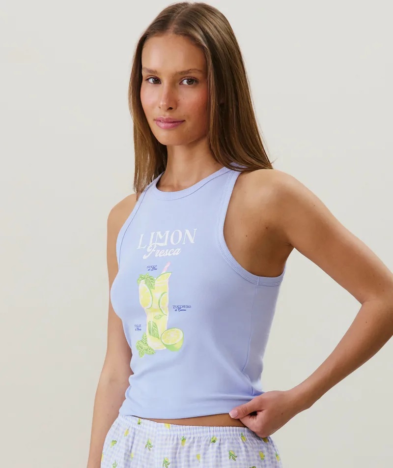MOCKITIZ es una camiseta de tirantes de jersey con un corte ajustado al cuerpo. Nos encanta su estampado de cóctel de limón, ultra fresco y divertido, ¡que evoca instantáneamente el sol, la playa y los aperitivos de verano! Para un look veraniego perfecto, combínala con el short NIGHTPOPIZ. Un plus: forma parte de nuestra gama We care.
