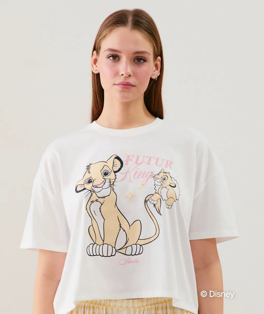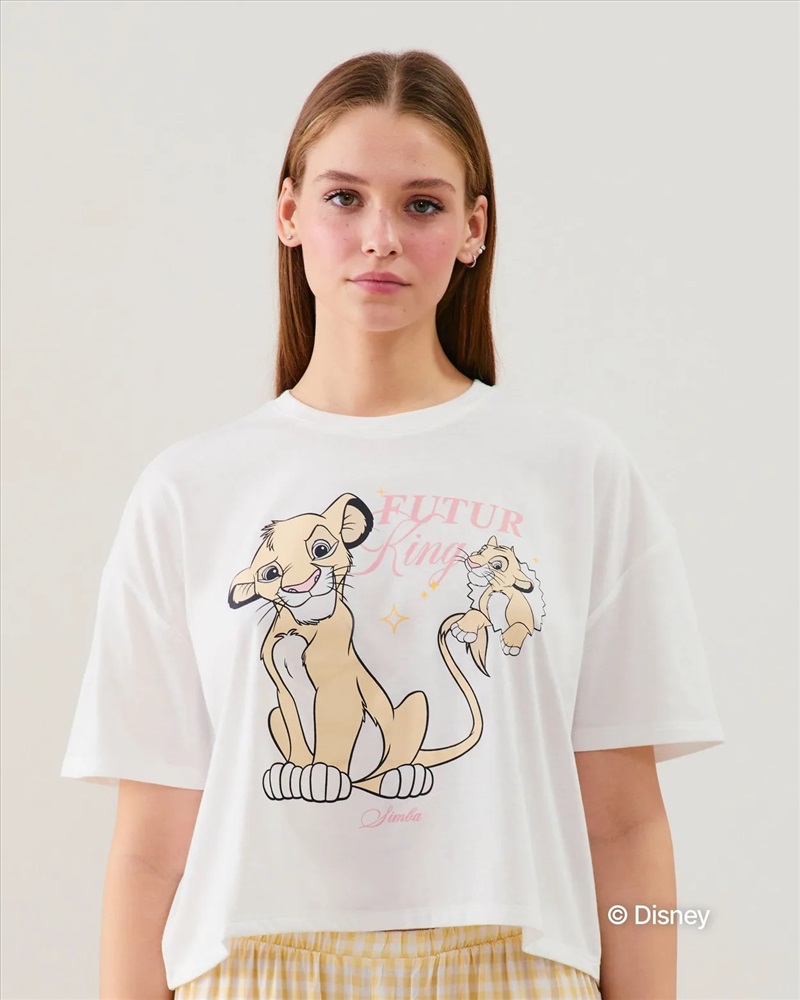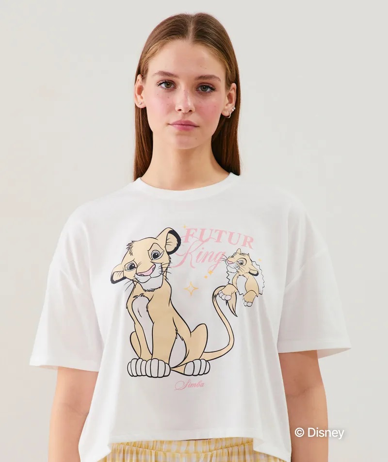¡Descubre tu nuevo top con licencia favorito! Con la imagen de tu héroe favorito, Simba, este top de jersey es perfecto para relajarte en casa mientras mantienes un look súper divertido. Su corte corto y suelto con mangas cortas ofrece una comodidad absoluta para un look relajado y con estilo. Además: forma parte de nuestra gama We care.