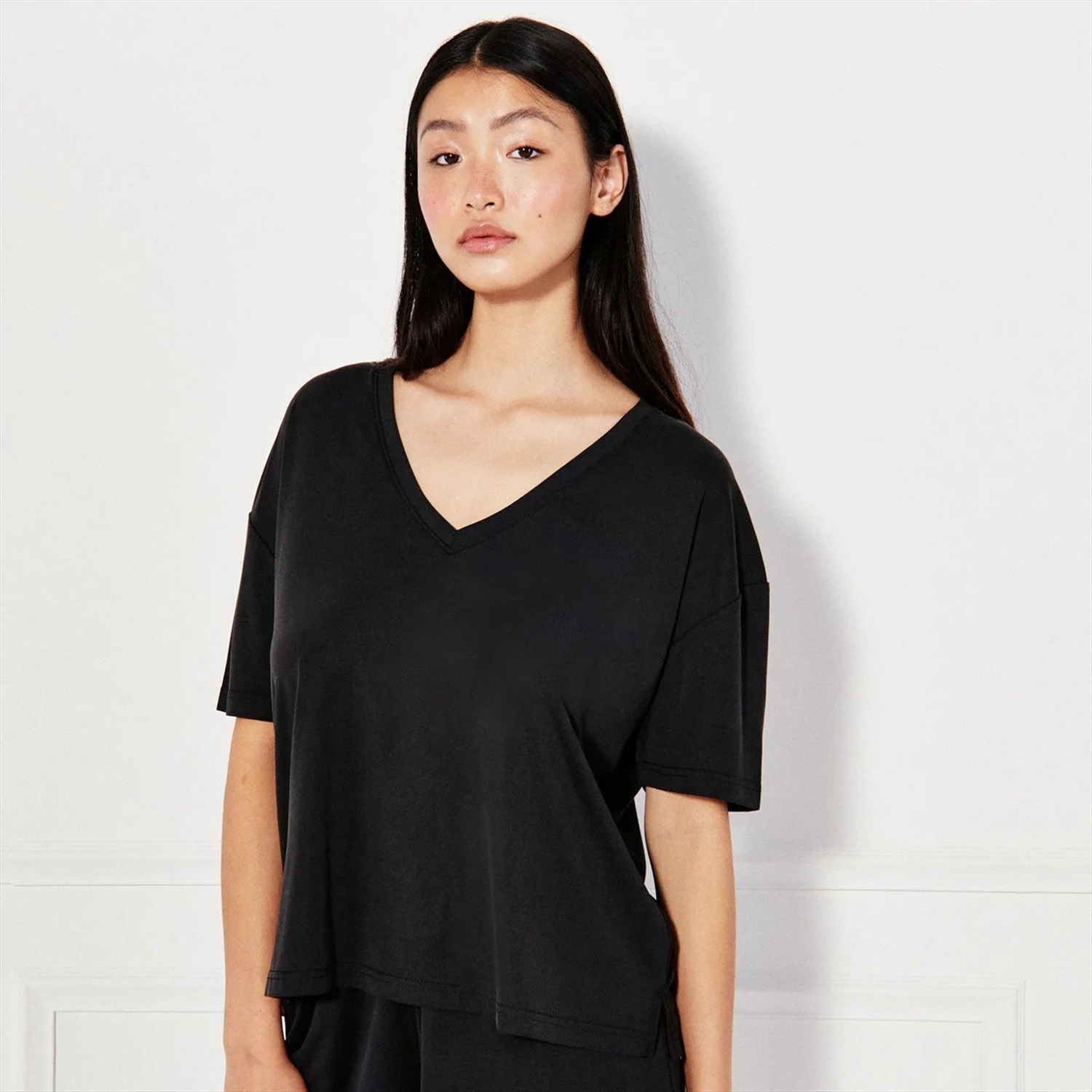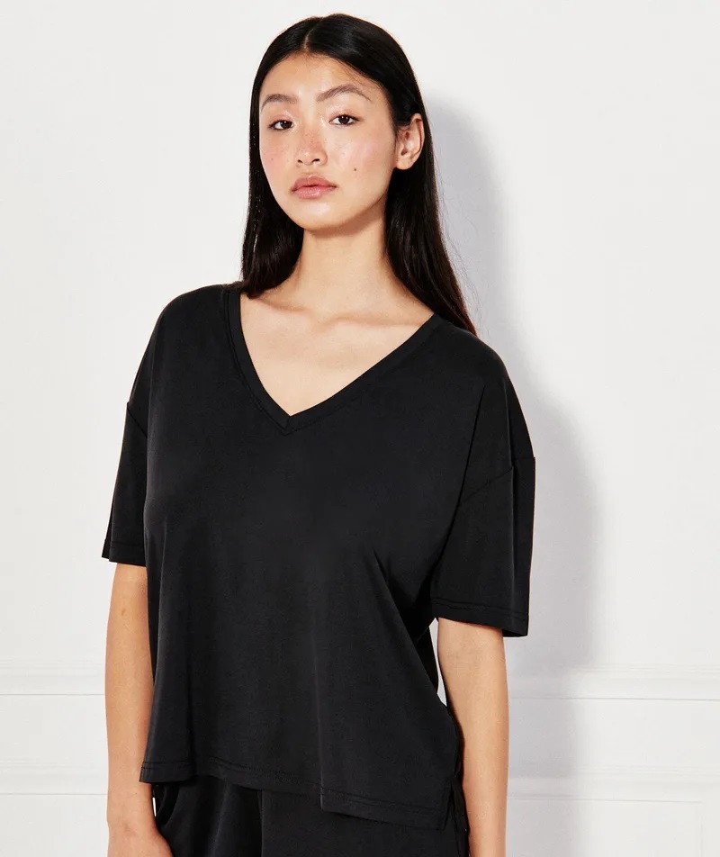 Descubre nuestro top JULILIZ en cupro negro, un material muy agradable al tacto. Este top con cuello de pico y corte amplio, combina elegancia y comodidad para un look chic y desenfadado. Es ideal para cualquier ocasión, se convertirá rápidamente en un básico de tu armario.