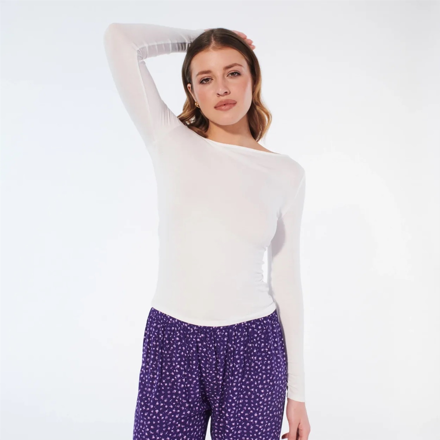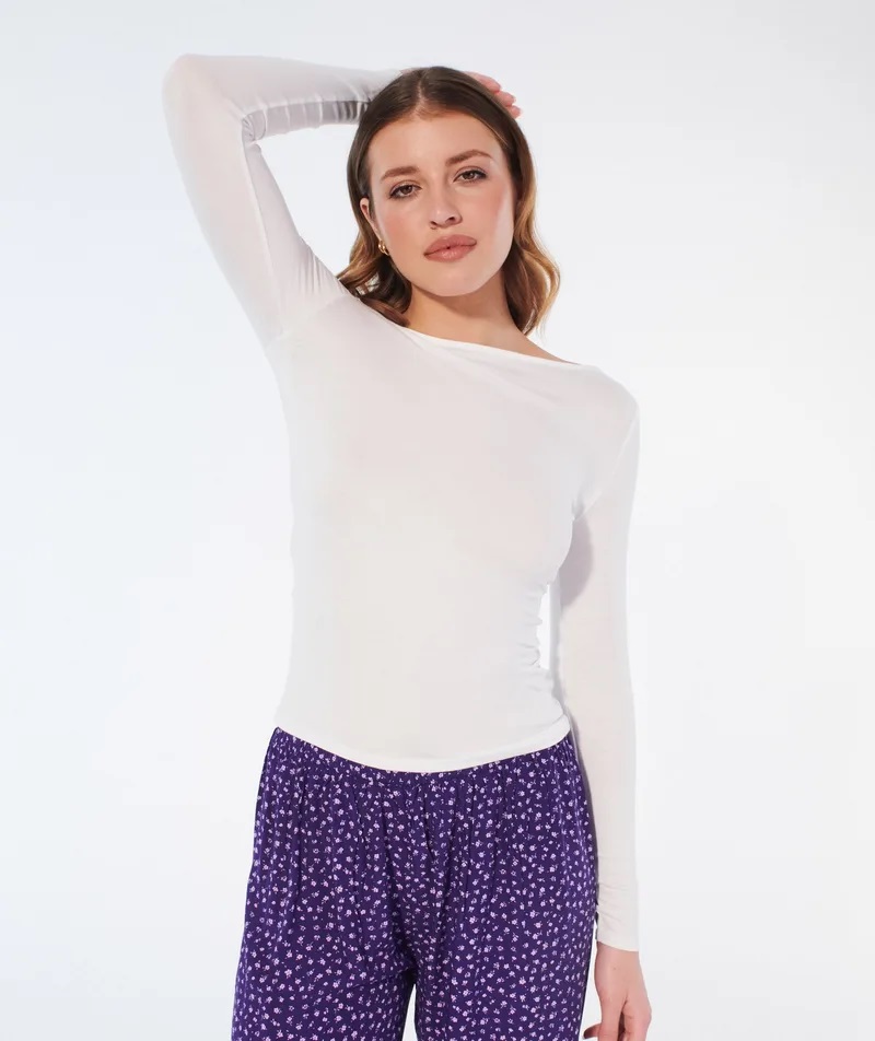 Enamórate de este top de pijama ZOLIZ blanco roto de punto jersey ultracómodo. La manga larga te abrigará, mientras que el cuello de barco realzará tu escote. Puedes combinarla con los pantalones ZOLIZ a juego para un look cómodo y a la última.