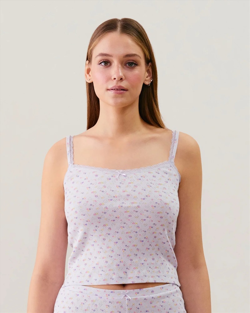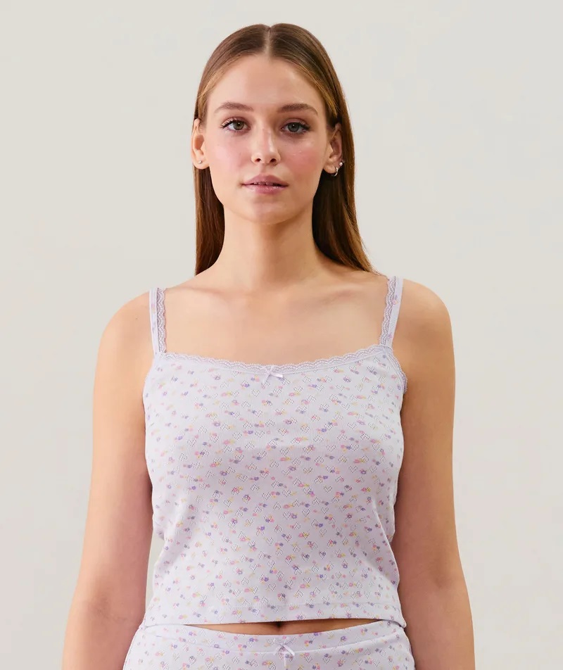 EMMALIZ es el nuevo pijama súper mono. Confeccionado en punto calado 100% algodón, es suave, cómodo y femenino a la vez. ¡Nos encanta el motivo de corazones del punto calado! La camiseta de tirantes tiene finos tirantes con bonitos detalles de encaje en los tirantes y el escote, así como un pequeño lazo en el centro. Para un look completo, combínalo con el short de la misma colección. Un plus: forma parte de nuestra gama We care.
