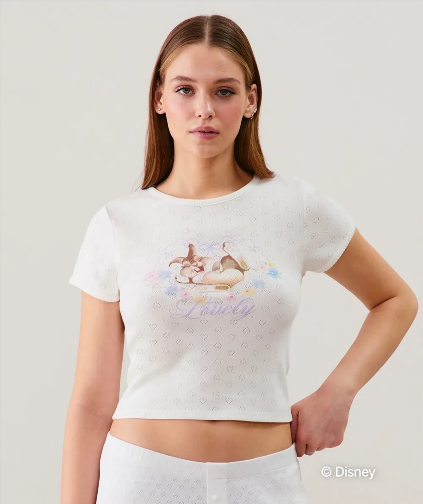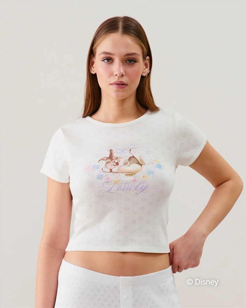 Enamórate de este top de algodón con la imagen de tu personaje favorito, Tambor. Nos encanta su punto calado en forma de corazón y su estampado de Tambor de estilo vintage, muy mono. Con sus mangas cortas, su corte ajustado y su efecto ligeramente crop, es perfecto para un look moderno y cómodo. Además: forma parte de nuestra gama We care.