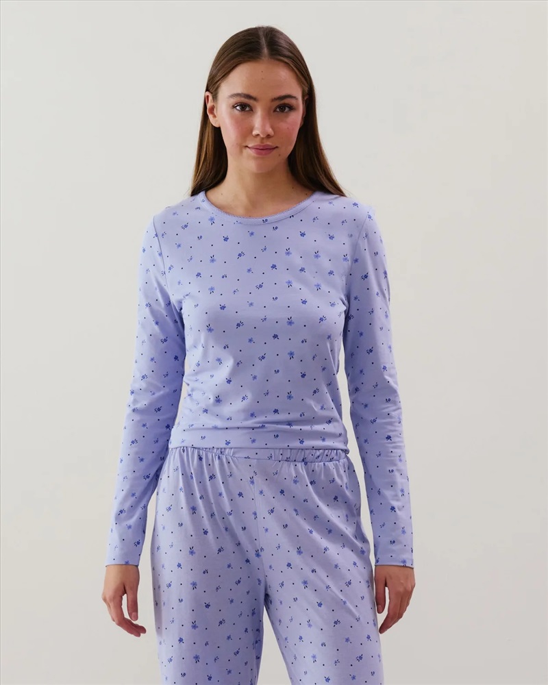 Descubre NIGHTBASICIZ, un top de manga larga entallado y de punto. Gracias a detalles como su cuello redondo con detalle de picot y sus pequeñas flores sobre fondo azul cielo, es un pijama en tendencia. Se puede combinar con el pantalón de la misma colección para esas noches de relax. Además, forma parte de nuestra gama We Care.