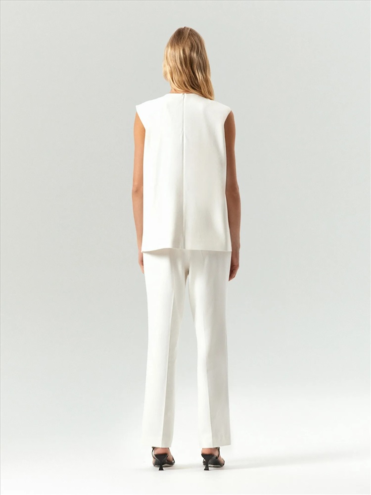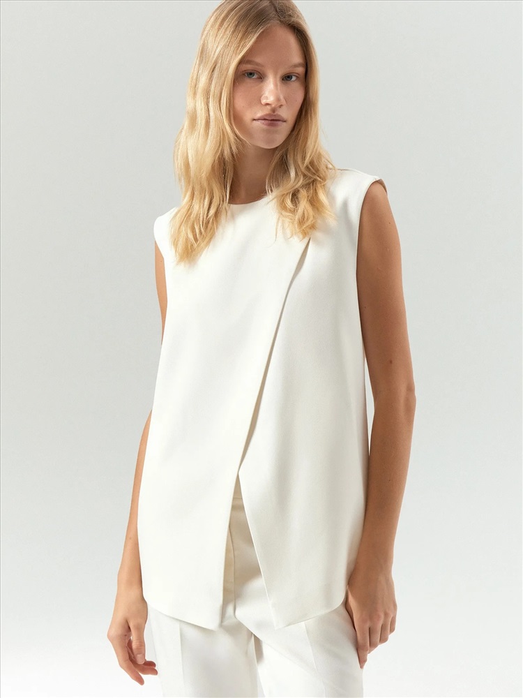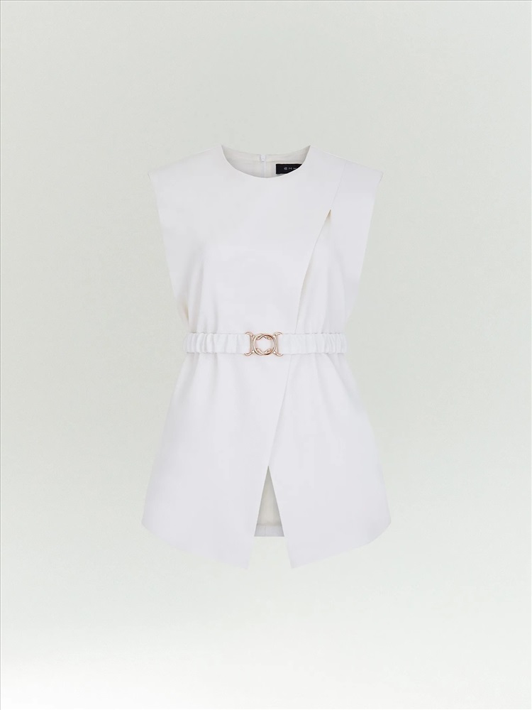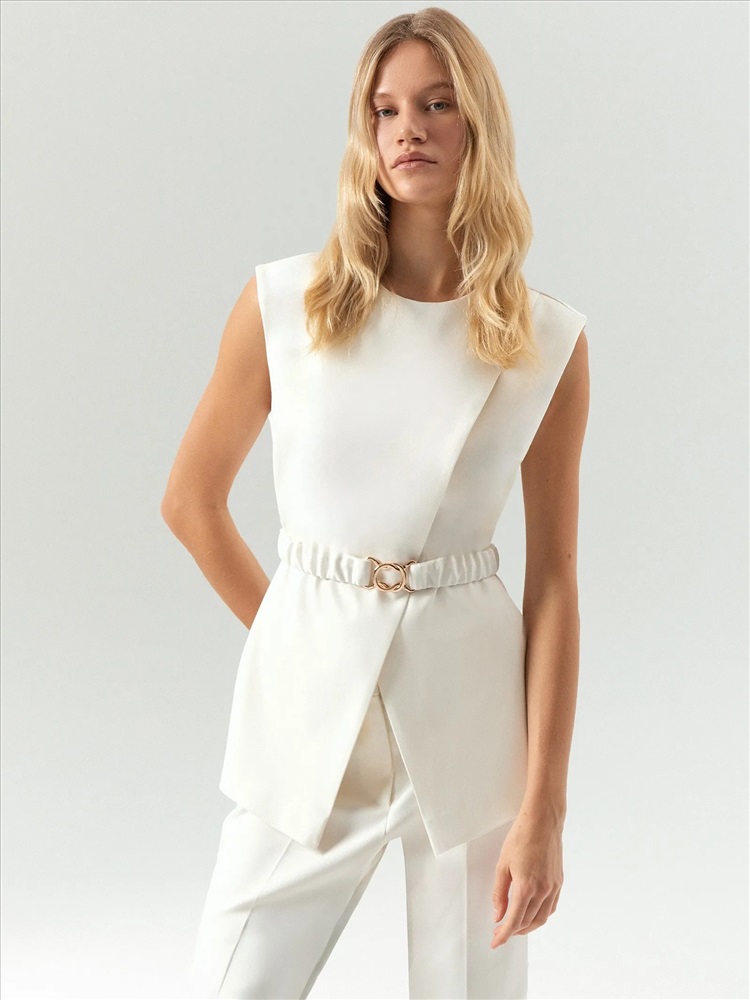 Блуза-жилет из костюмной ткани станет любимой вещью в гардеробе. Будет идеальна и в офис, и к выходным, и на праздник. Она достаточно лаконичная для будней и в то же время достаточно небанальная для особых случаев. Модель внахлёст дополнена стильным драпированным поясом с изящной застёжкой в золотом цвете. Пояс эластичный, выполнен на резинке. Жилет эффектно смотрится и под пояс, и без. Молочный цвет — дорогой, всегда актуальный и универсальный, поддержит любое настроение. Завершить образ можно брюками из комплекта.