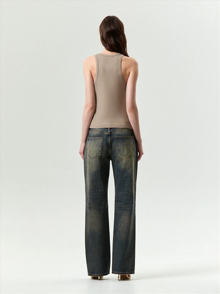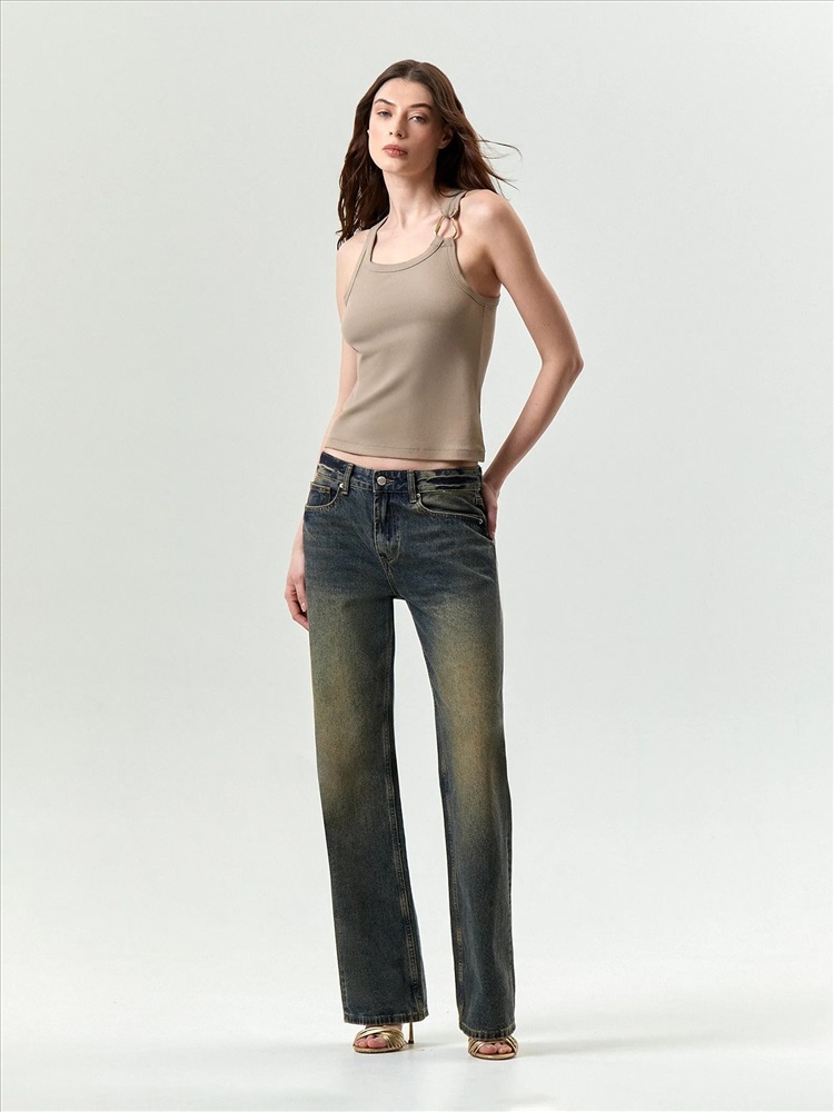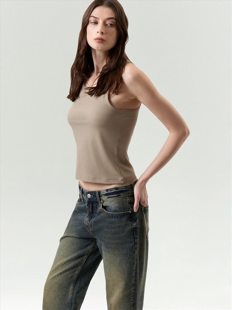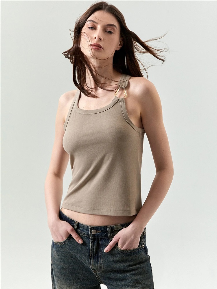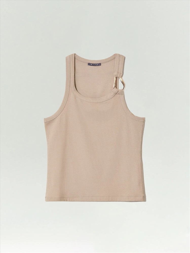 Трикотажный топ в светло-кофейном цвете для модных кэжуальных образов. Имеет металлическую вставку в одной из бретелей, отделан планкой по вороту и проймам. Модель по фигуре делают ещё удобнее глубокие проймы и широкие бретели. Топ можно сочетать с любым денимом. Изделие выполнено из эластичного материала с содержанием вискозы.