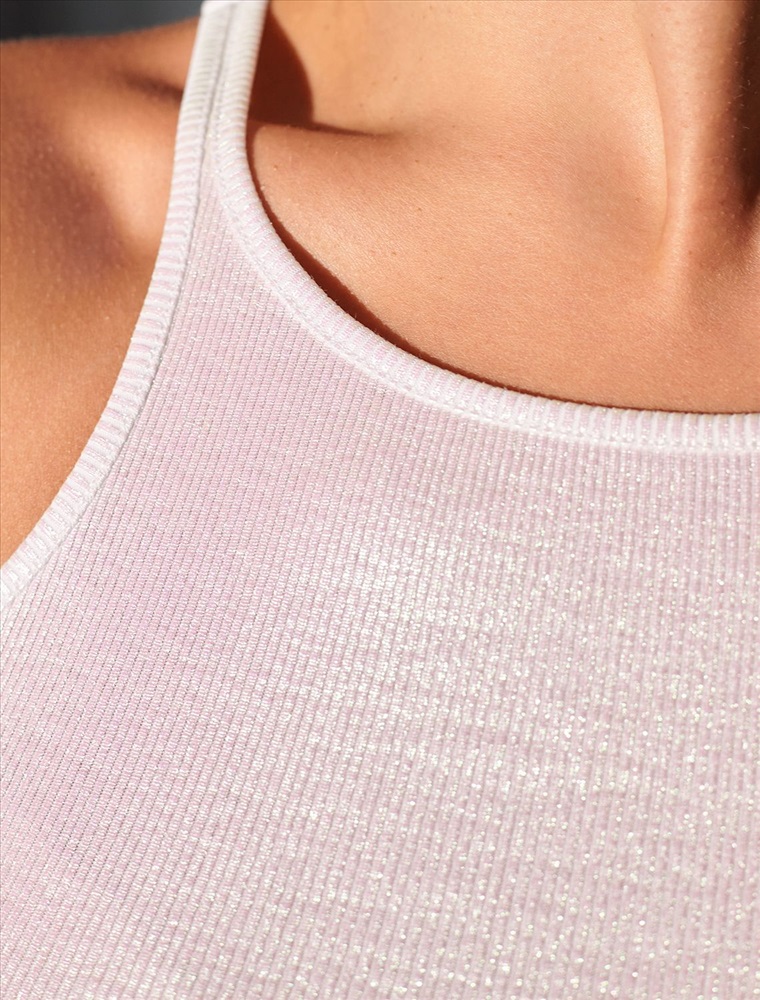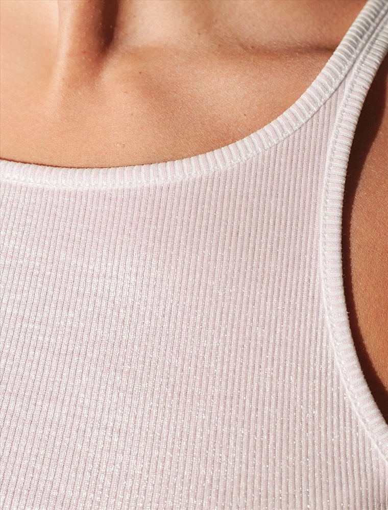 Эффектный топ перламутрового цвета из мягкого хлопка с эластаном представлен в стильном исполнении с матовым покрытием металлик. Мелкий рубчик визуально вытягивает силуэт и подчеркивает фигуру, делая образ более стройным и аккуратным. Круглый ворот и суженные лямки акцентируют внимание на линии ключиц, делая образ утонченным и изысканным, Благодаря деликатному блеску топ подходит для тех, кто ценит утонченность и стремится добавить в образ немного сияния без перебора - это отличный вариант топа для любительниц минимализма.