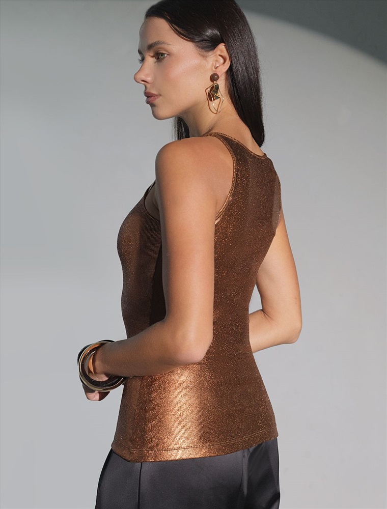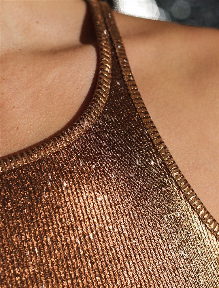 Плотность: 175 Г/м2 Эффектный топ кофейного цвета из мягкого хлопка с эластаном представлен в стильном исполнении с матовым бронзовым покрытием металлик с серебристыми вкраплениями. Мелкий рубчик визуально вытягивает силуэт и подчеркивает фигуру, делая образ более стройным и аккуратным. Круглый ворот и суженные лямки акцентируют внимание на линии ключиц, делая образ утонченным и изысканным, Благодаря деликатному блеску топ подходит для тех, кто ценит утонченность и стремится добавить в образ немного сияния без перебора - это отличный вариант топа для любительниц минимализма. Натуральный дышащий материал обеспечивает комфортный микроклимат на протяжении всего дня, не вызывая дискомфорта даже при длительном ношении. Износостойкое покрытие сохраняет блеск и привлекательность майки несмотря на частое использование. Топ прекрасно сочетается с деловым костюмом или аксессуарами, позволяя создавать как строгие, так и вечерние образы. Комментарии к товару