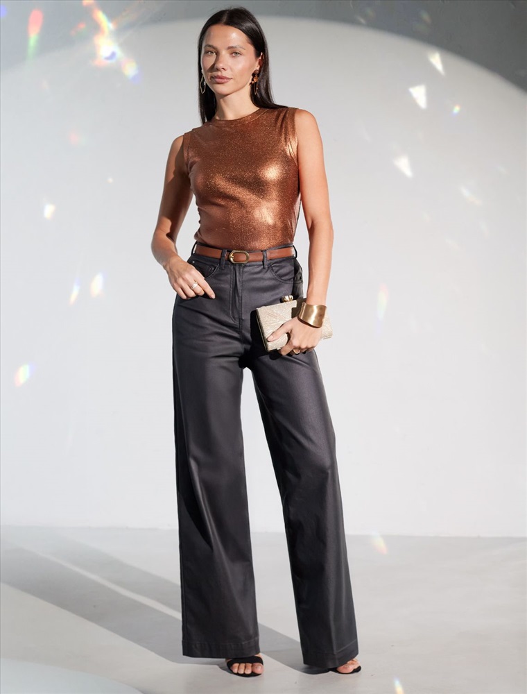Трендовый матовый металлизированный эффект создает сияющий бронзовый блеск с серебристыми вкраплениями без излишней яркости — это делает топ нарядным и красивым как для праздничного события, так и для повседневной носки в комплекте с деловым костюмом или джинсами. Широкие лямки обеспечивают дополнительный комфорт в течение всего дня. Круглый ворот подчеркивает линию шеи, добавляя образу изысканности.