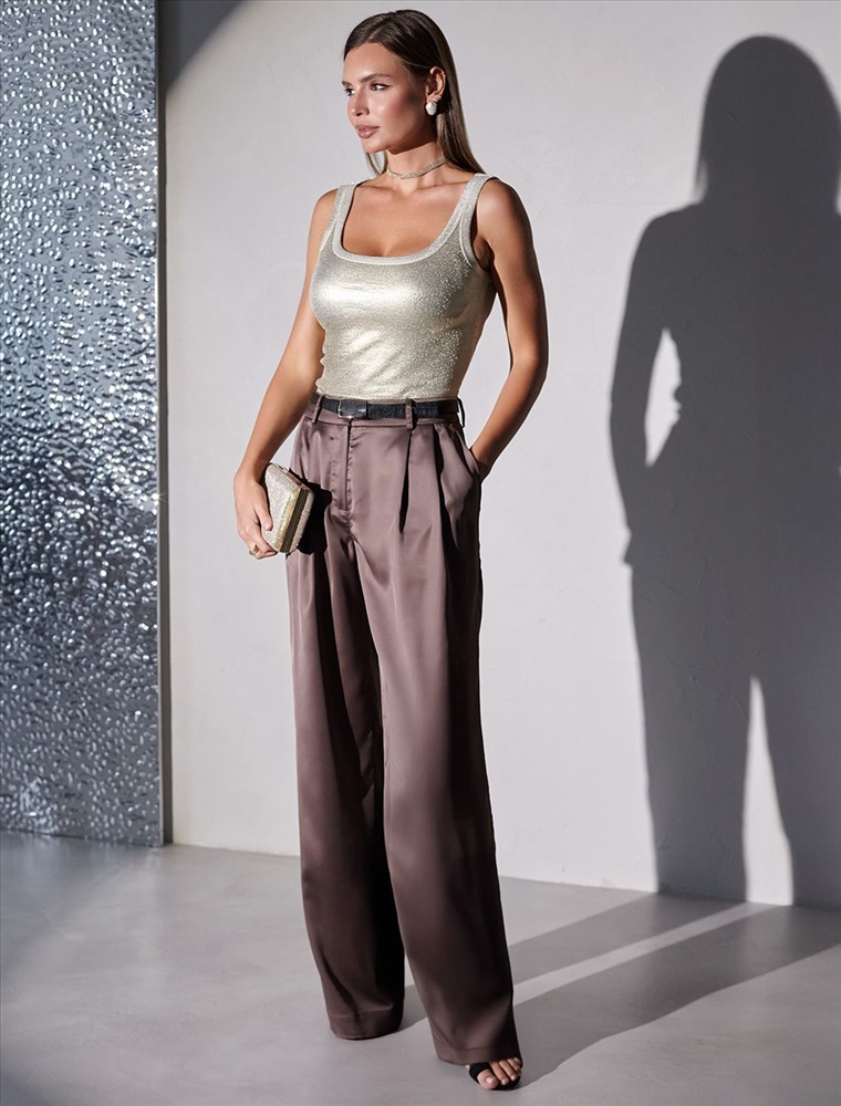 Эффектный топ золотистого цвета с широкими лямками — идеальный выбор для создания стильного образа на каждый день или вечерний выход. Ткань в мелкий рубчик визуально вытягивает силуэт, правильный крой подходит на любую фигуру, комфортно садится на большие размеры, не сковывая движений. Изысканный матовый блеск металлик добавляет современный акцент даже самому простому образу.