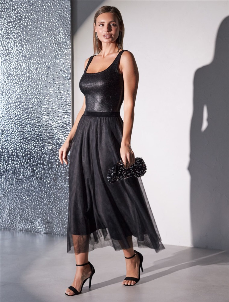 Эффектный топ черного цвета с широкими лямками — идеальный выбор для создания стильного образа на каждый день или вечерний выход. Ткань в мелкий рубчик визуально вытягивает силуэт, правильный крой подходит на любую фигуру, комфортно садится на большие размеры, не сковывая движений. Изысканный матовый блеск металлик добавляет современный акцент даже самому простому образу.